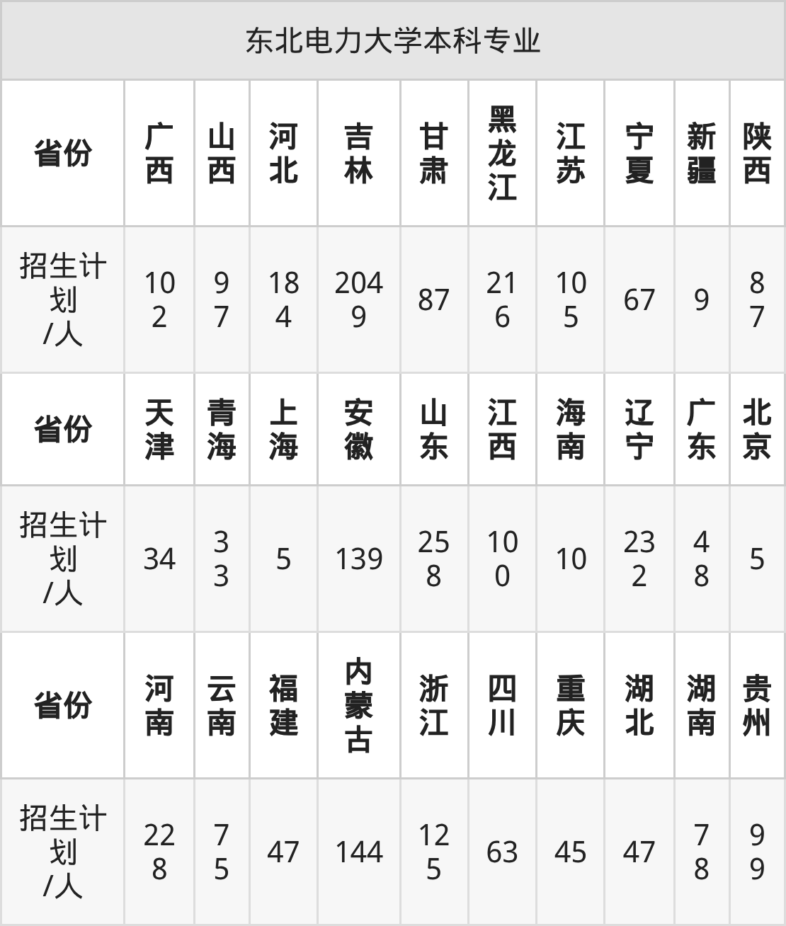 东北电力大学面向四川(63人)、海南(10人)、吉林(2049人)、上海(5人)、广西(102人)、浙江(125人)、贵州(99人)等30个地区开展本科招生。其中新疆招生批次为本科二批,四川、云南、宁夏招生批次为本科批B段,其余省份为本科批。