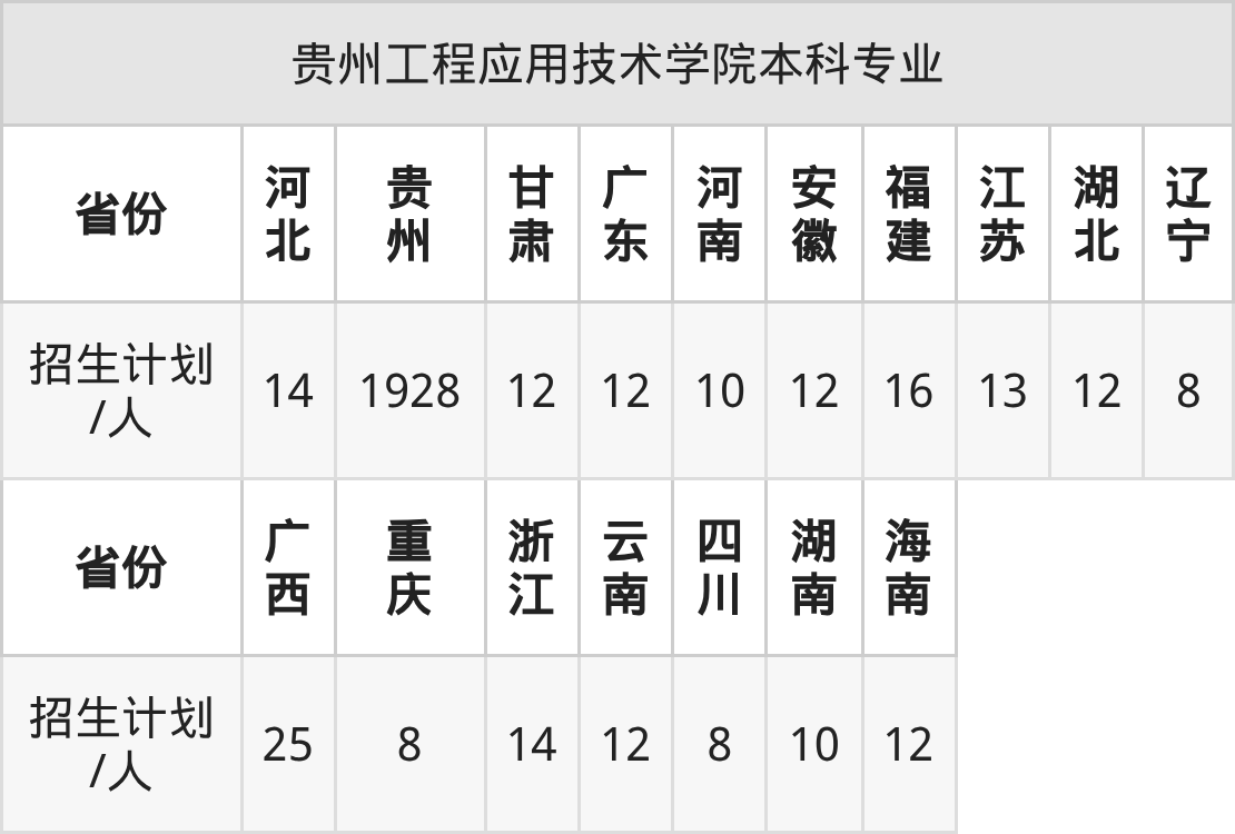 贵州工程应用技术学院面向湖南(10人)、广东(12人)、云南(12人)、四川(8人)、湖北(12人)、海南(12人)、辽宁(8人)等17个地区开展本科招生。其中甘肃招生批次为本科批C段,云南、四川招生批次为本科批B段,其余省份为本科批。