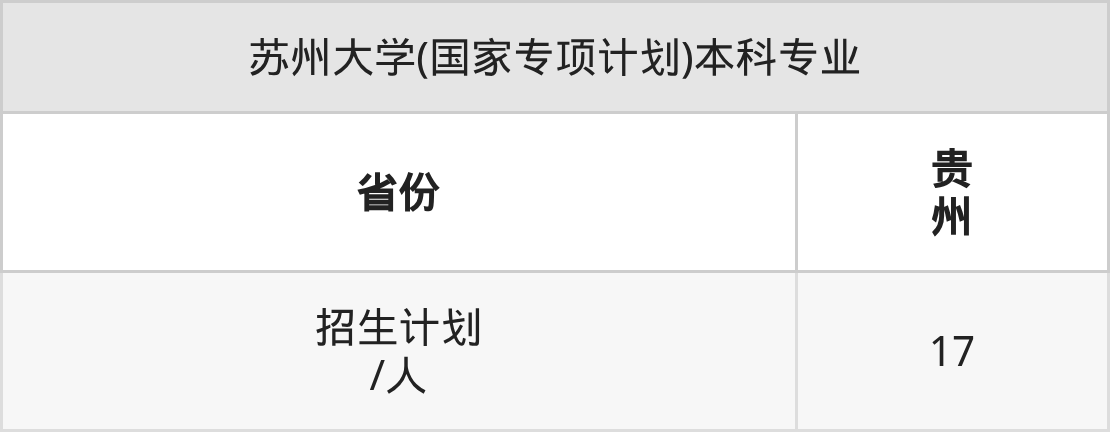 苏州大学(国家专项计划)面向贵州(17人)开展本科招生。招生批次为本科批。