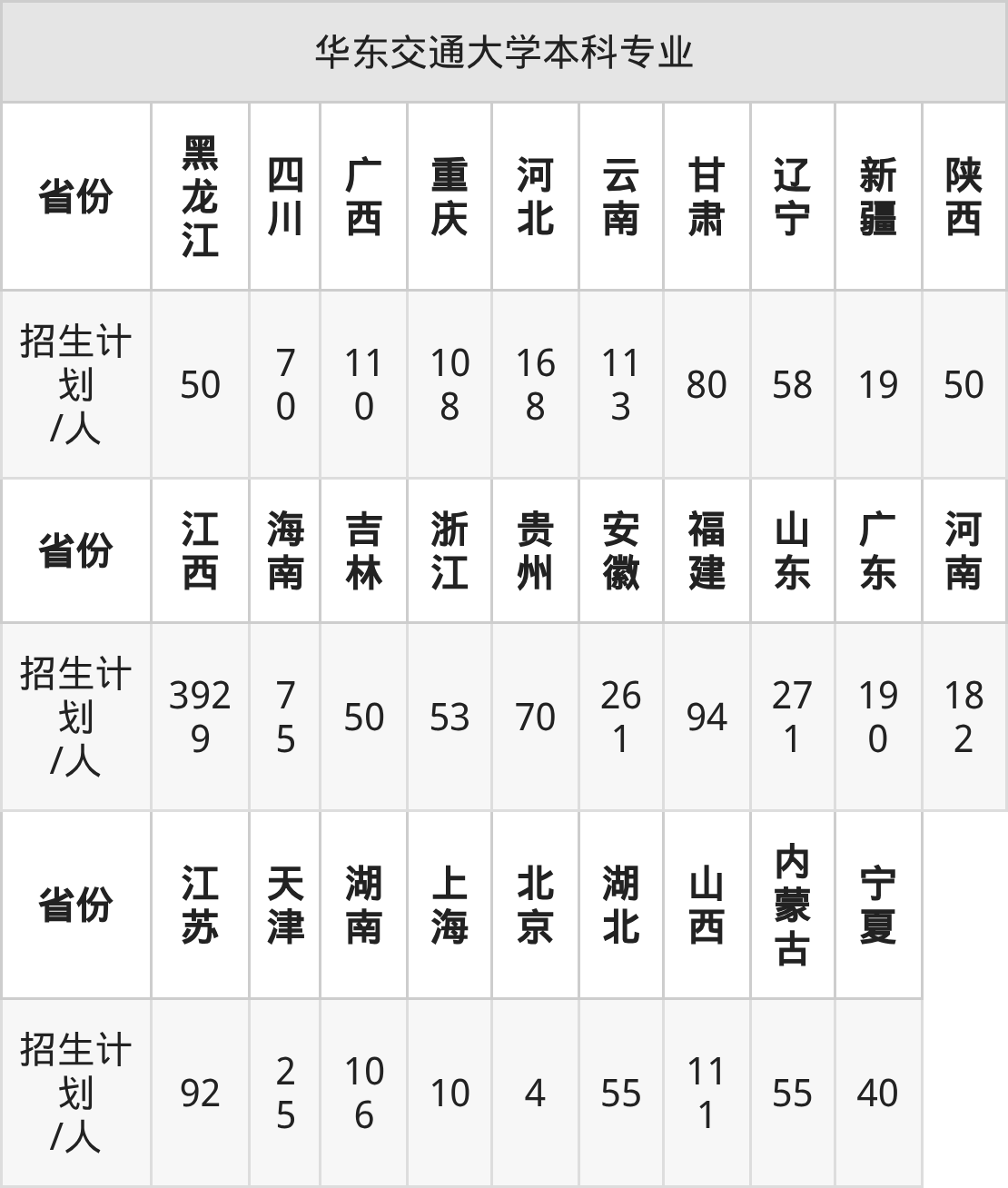 华东交通大学面向江西(3929人)、湖北(55人)、福建(94人)、北京(4人)、云南(113人)、宁夏(40人)、安徽(261人)等29个地区开展本科招生。其中甘肃招生批次为本科批C段,宁夏、云南、四川招生批次为本科批B段,其余省份为本科批。