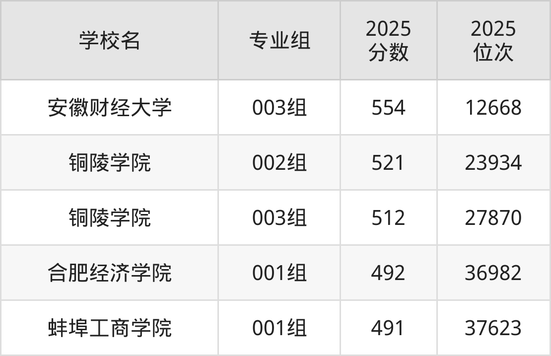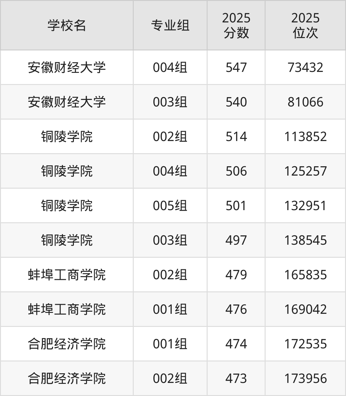 安徽省所有财经类院校2025年录取分数线一览表(前10院校专业组):