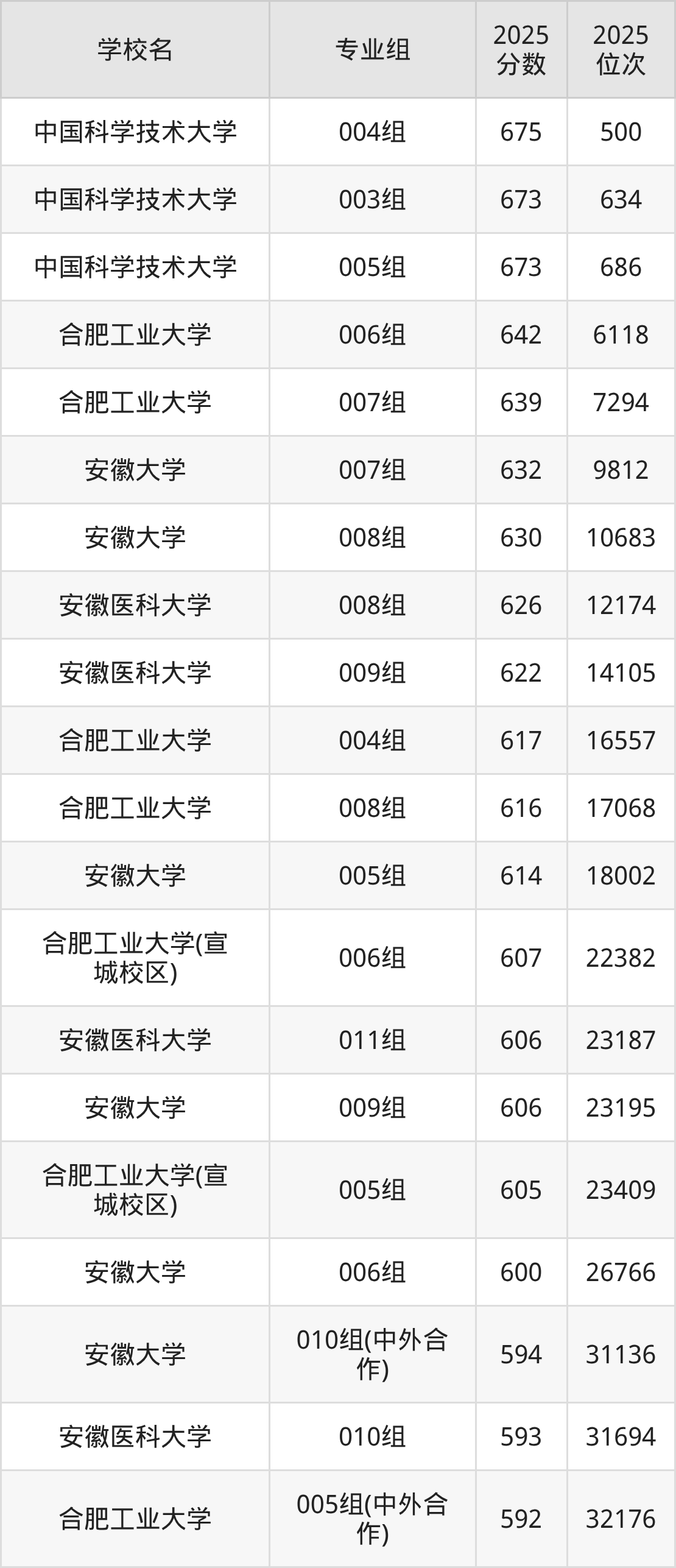 物理类最难考、收分最高的是:中国科学技术大学,2025年学校的004组最低分675分,对应排位500名;历史类最难考、收分最高的是:合肥工业大学,2025年学校的002组最低分605分,对应排位2735名。