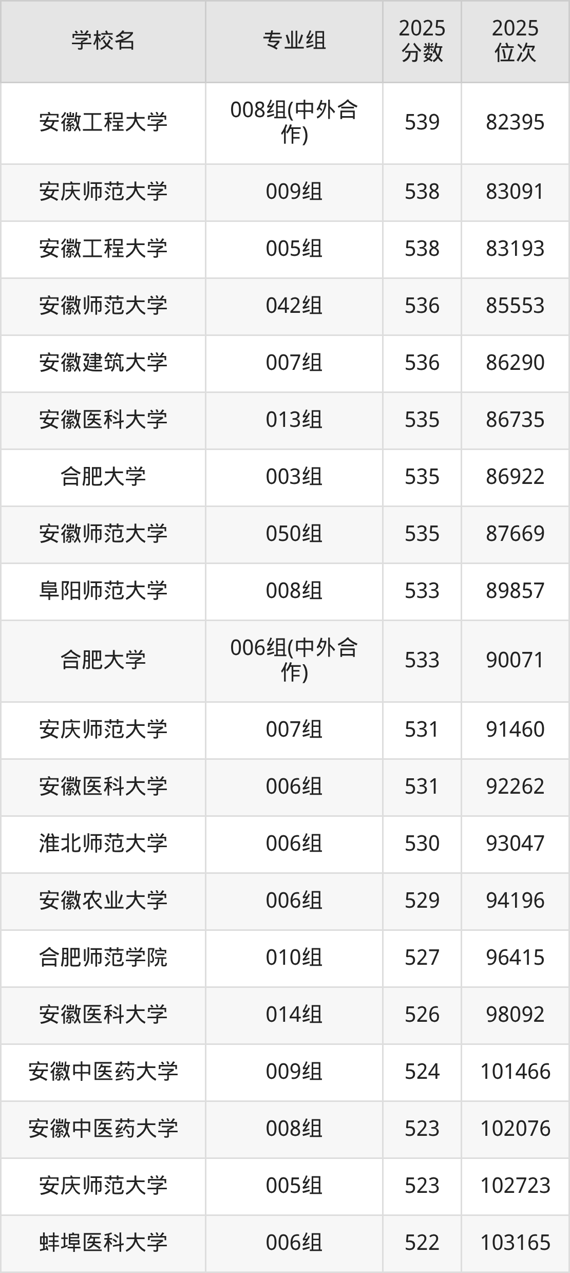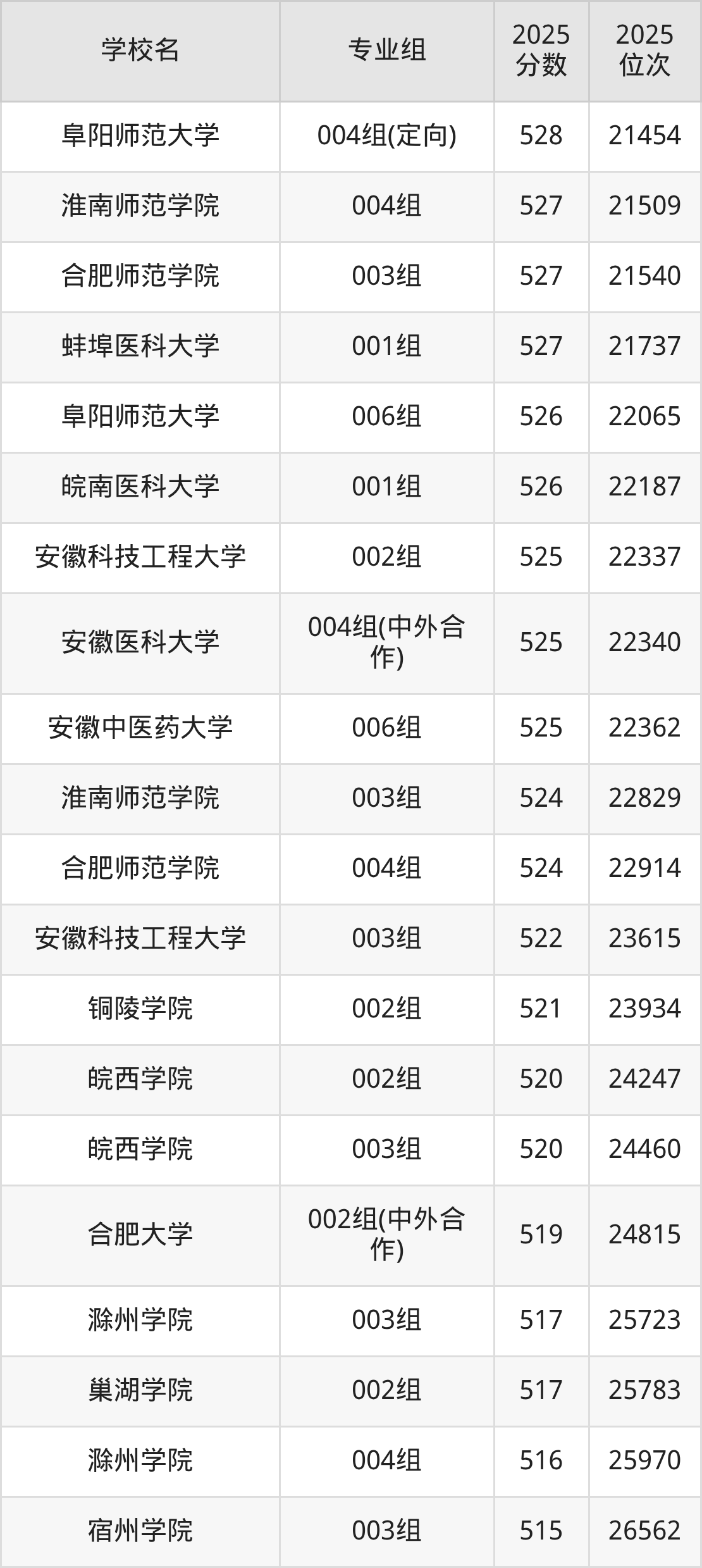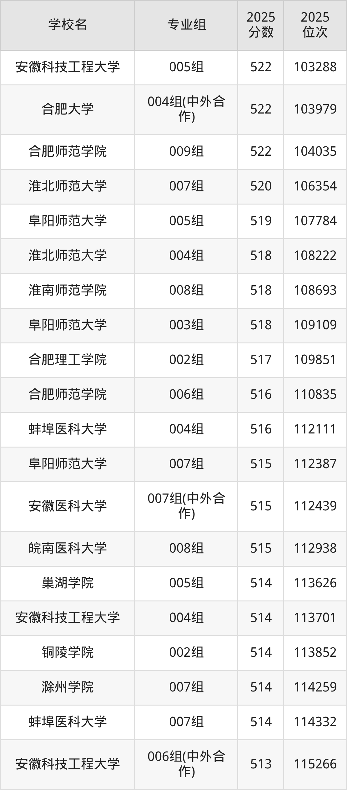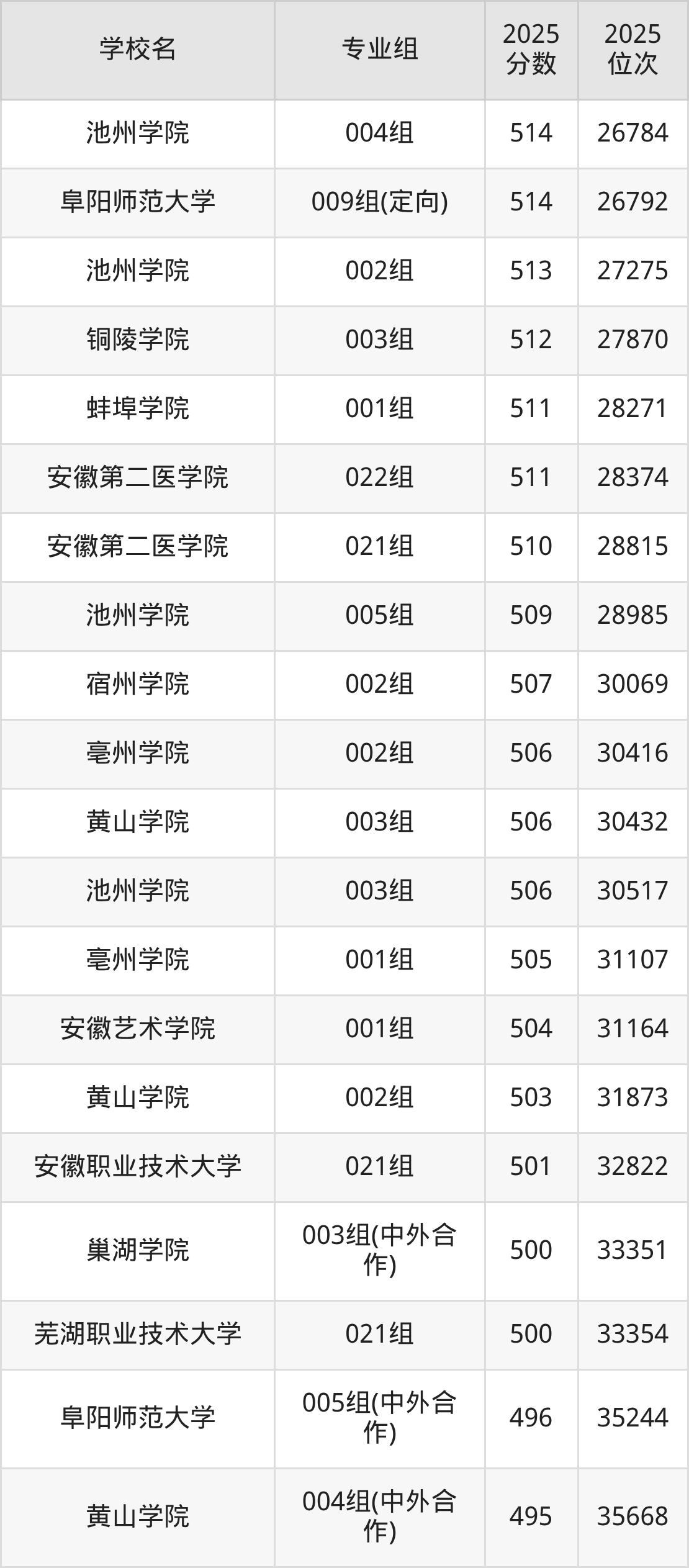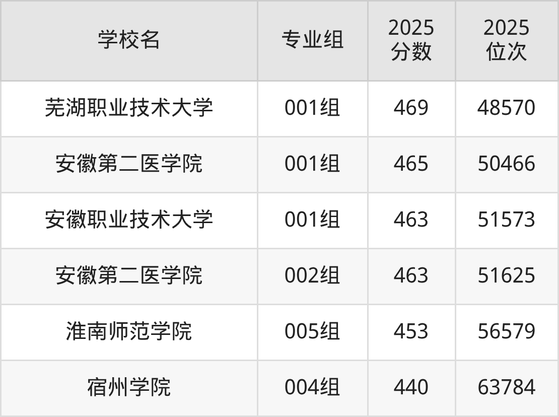 物理类最好考、收分最低的是:安徽第二医学院,2025年005组最低分427分,最低排名231596名;历史类最好考、收分最低的是:宿州学院,2025年004组最低分440分,最低排名63784名。