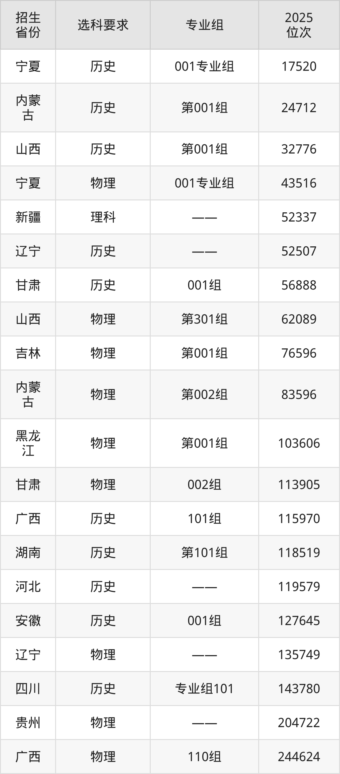 辽宁建筑职业学院2025年在全国各省的位次差异较大,最高位次是17520位(宁夏历史类)、最低位次是310139位(河北物理类)。各省具体位次请看下图: