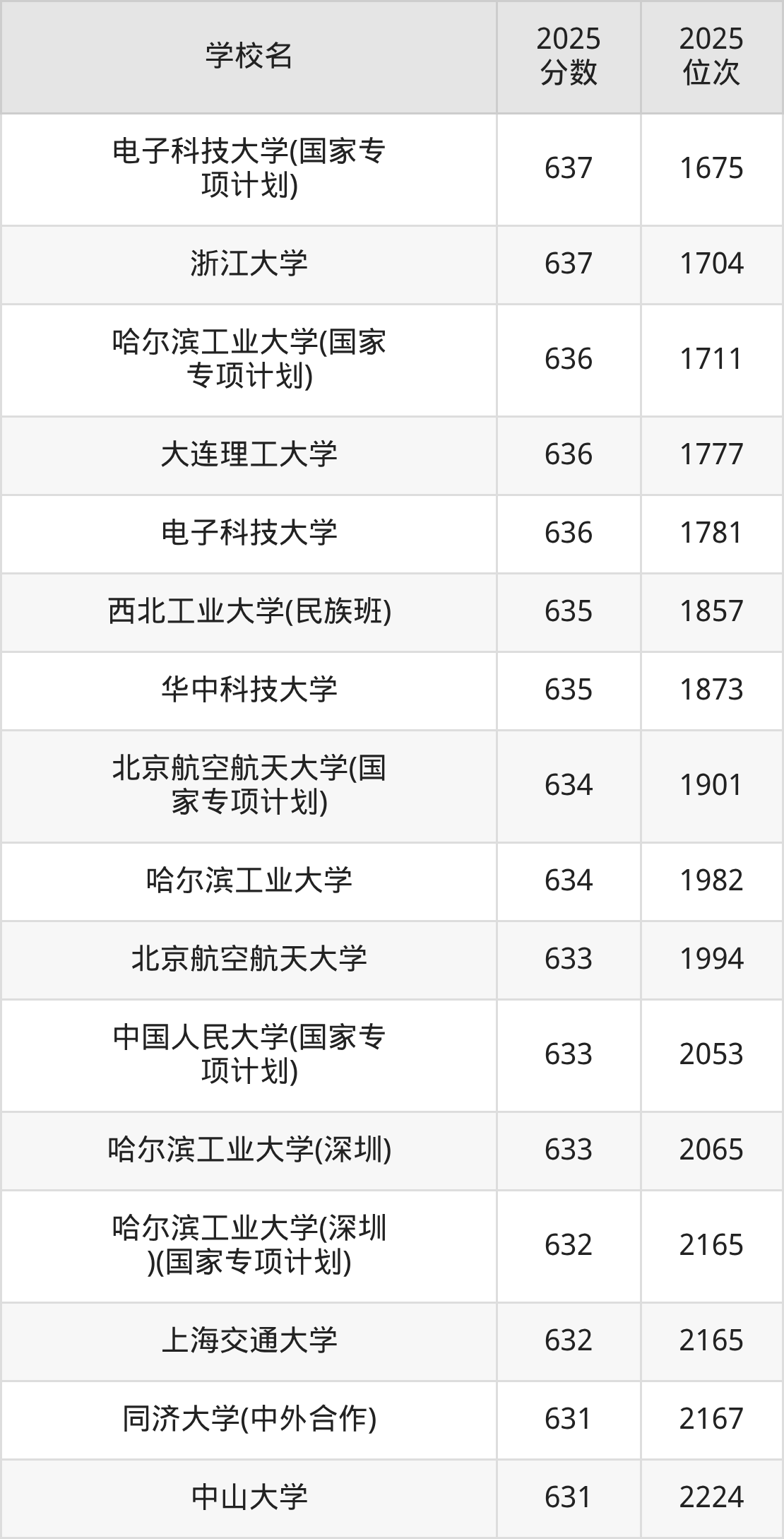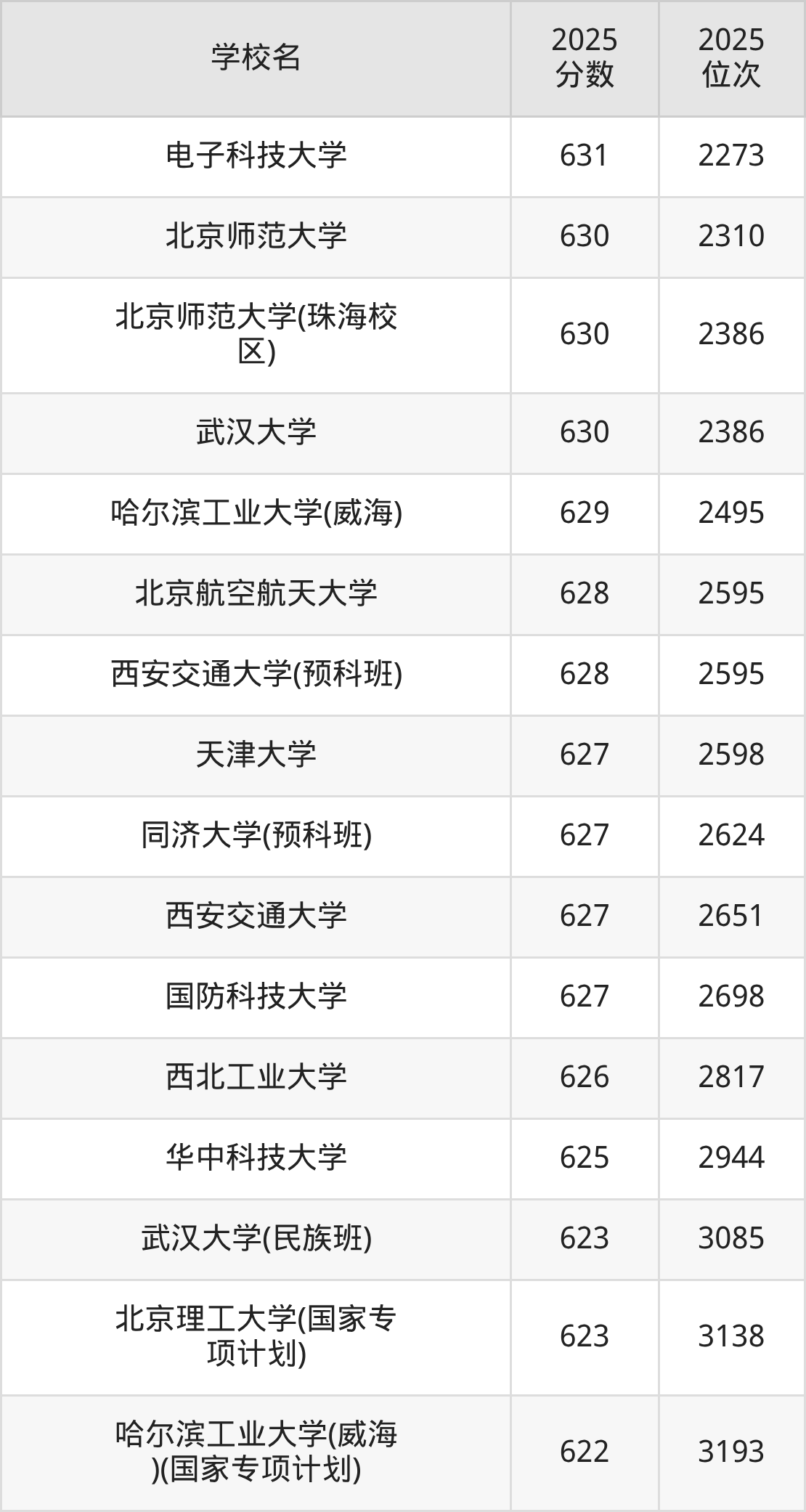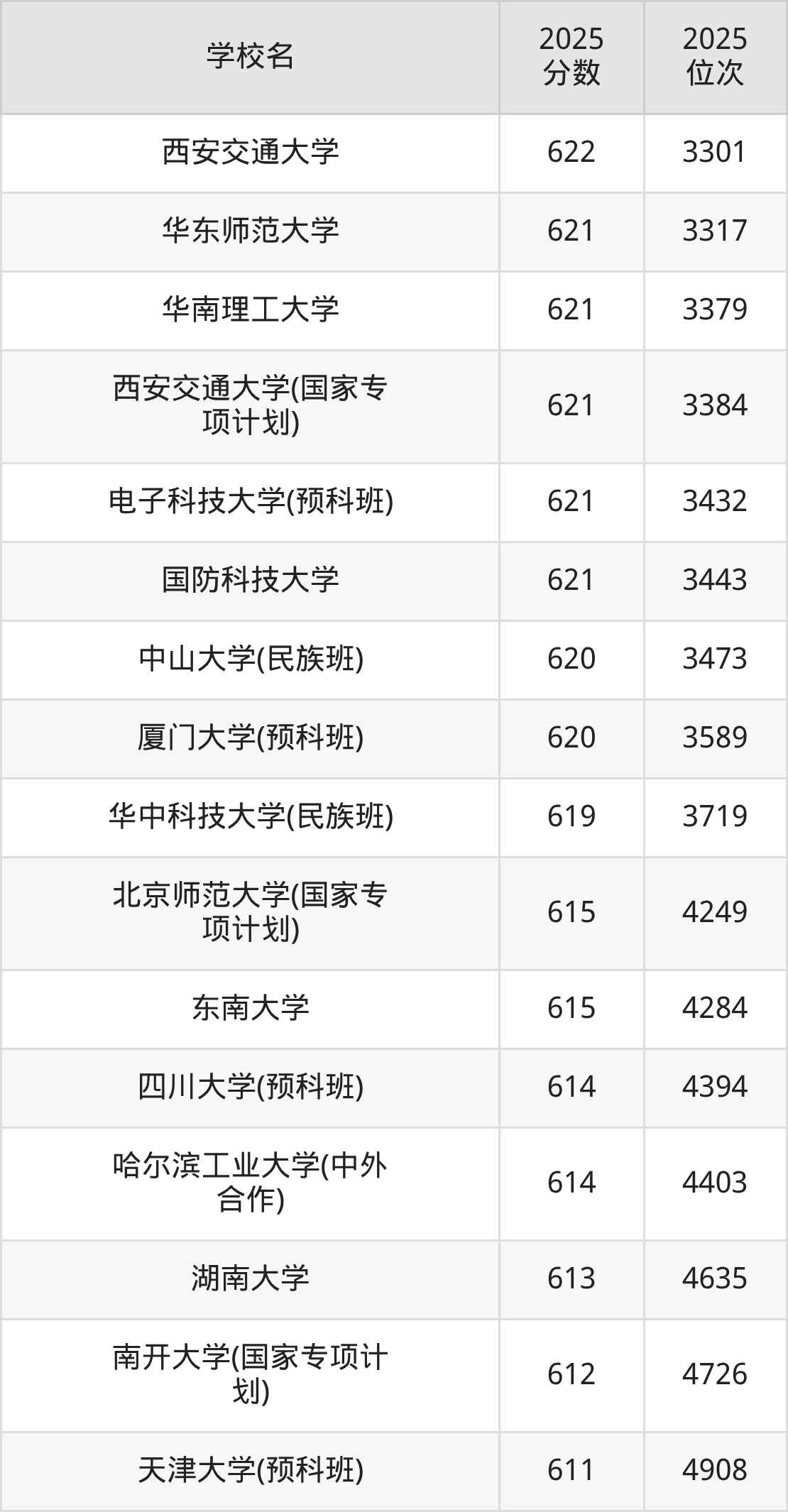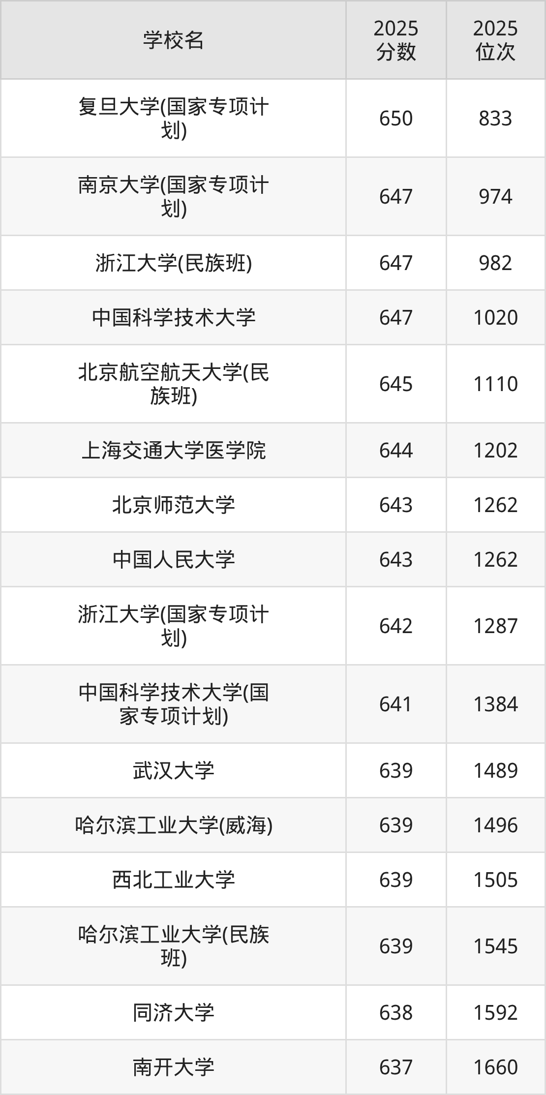 温馨提示:全国各省录取分数线不相同,本文以贵州省为例,为大家带来2025年录取分数线位于600到650分的985大学名单汇总,并附上该分数段对应的位次排名区间,供查阅。