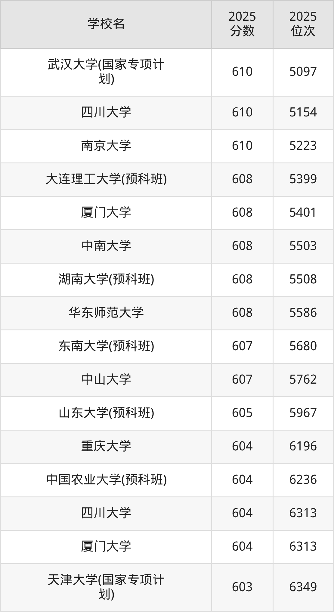 鉴于录取分数线存在一定波动,本文特此整理2025年高考600到650分数段所对应的位次排名区间,供2026年高考成绩处于该位次范围内的考生参考上文所列院校信息。需说明的是,本文内容仅适用于贵州省高考。