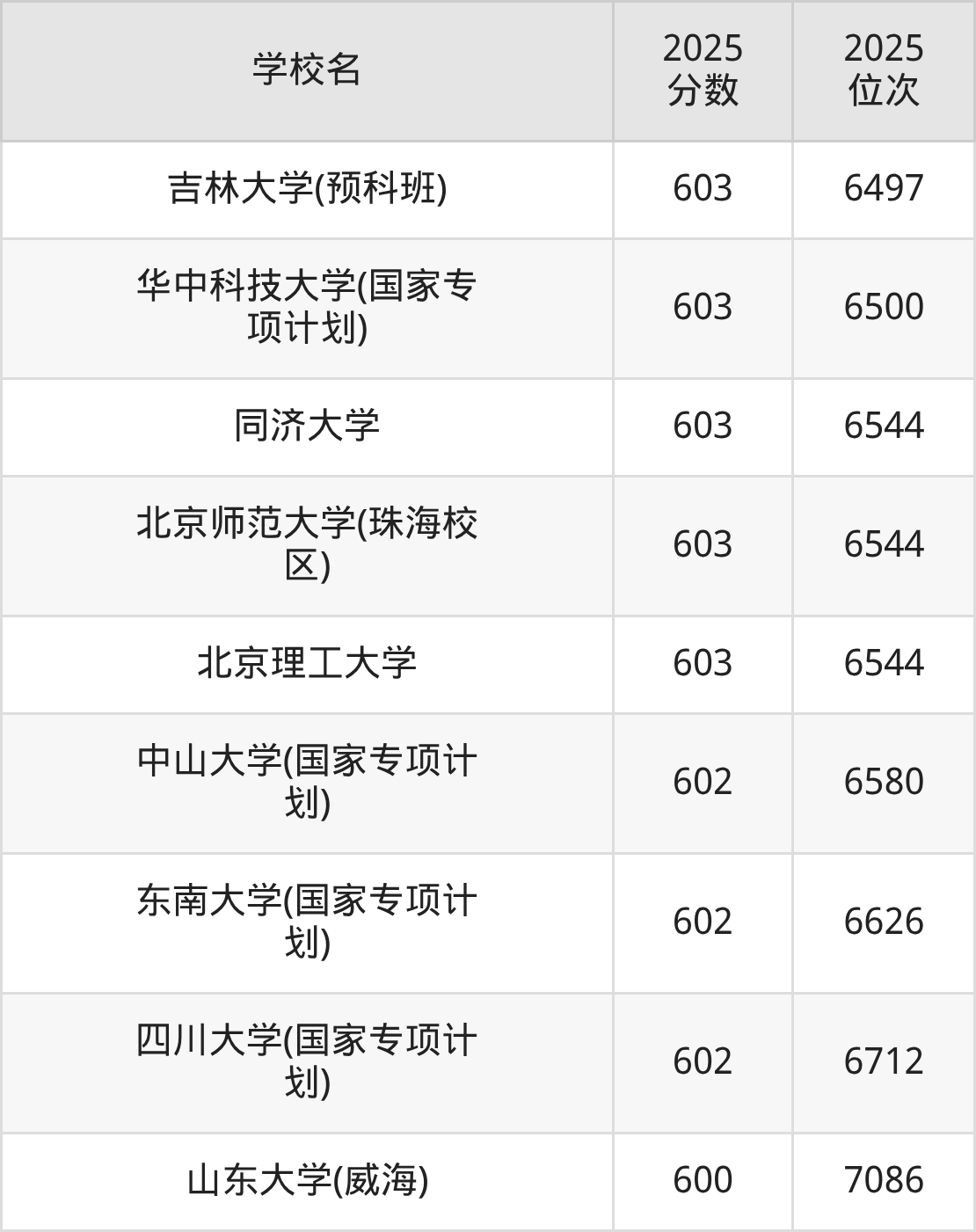 物理类600到650分的大学中分数对应位次最高的是复旦大学(国家专项计划),2025年最低分650分,对应最低位次是833名;分数对应位次最低的是山东大学(威海),2025年最低分600分,对应最低位次是7086名。