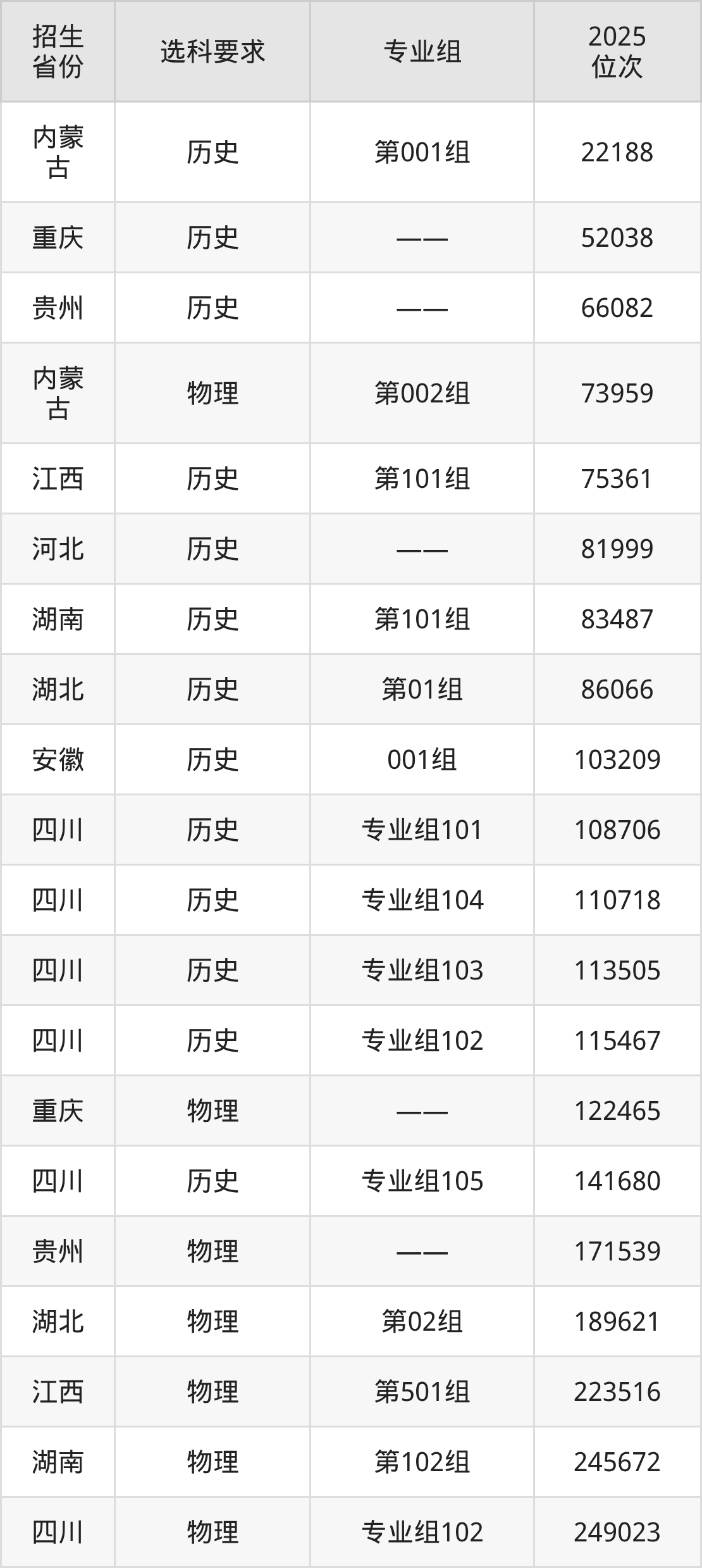 重庆青年职业技术学院2025年在全国各省的位次差异较大,最高位次是22188位(内蒙古历史类)、最低位次是278202位(安徽物理类)。各省具体位次请看下图:
