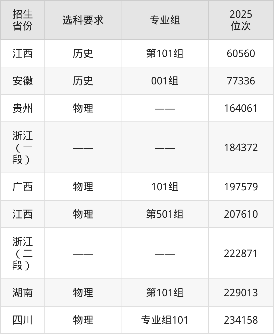 衢州职业技术学院2025年在全国各省的位次差异较大,最高位次是60560位(江西历史类)、最低位次是234158位(四川物理类)。各省具体位次请看下图: