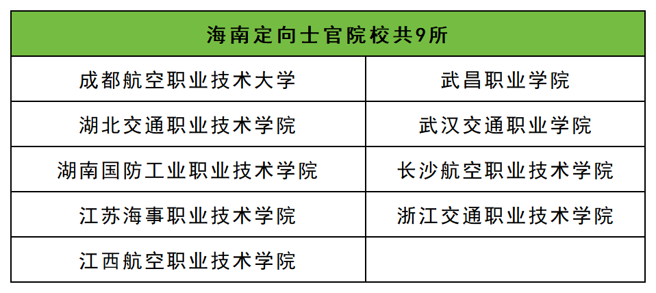 在海南招收定向培养军士的院校共计9所,全部为省外高校,包含江苏海事职业技术学院、浙江交通职业技术学院等。