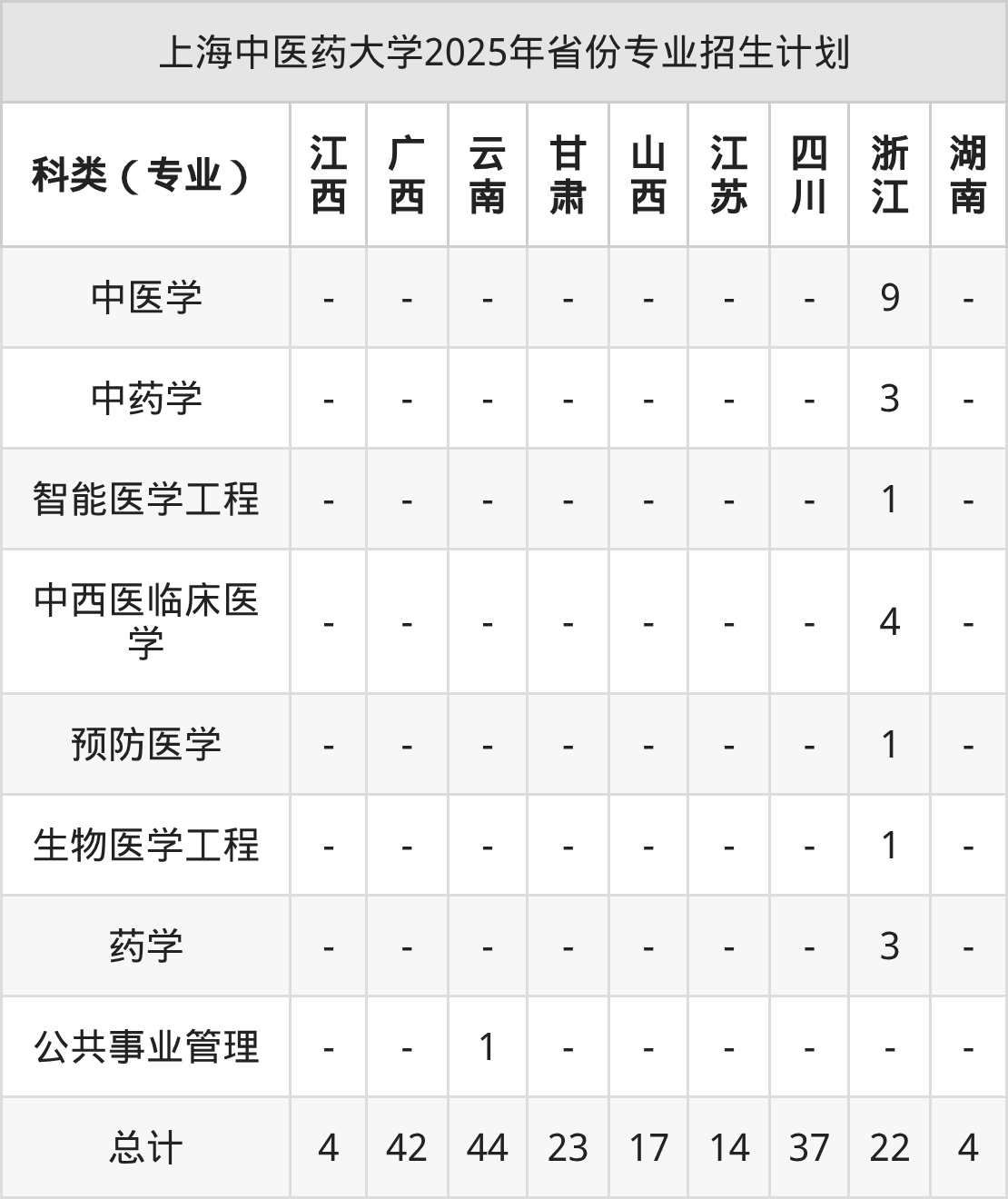 而各省份的招生计划数为湖南4人,贵州38人,江西4人,广西42人,云南44人等。