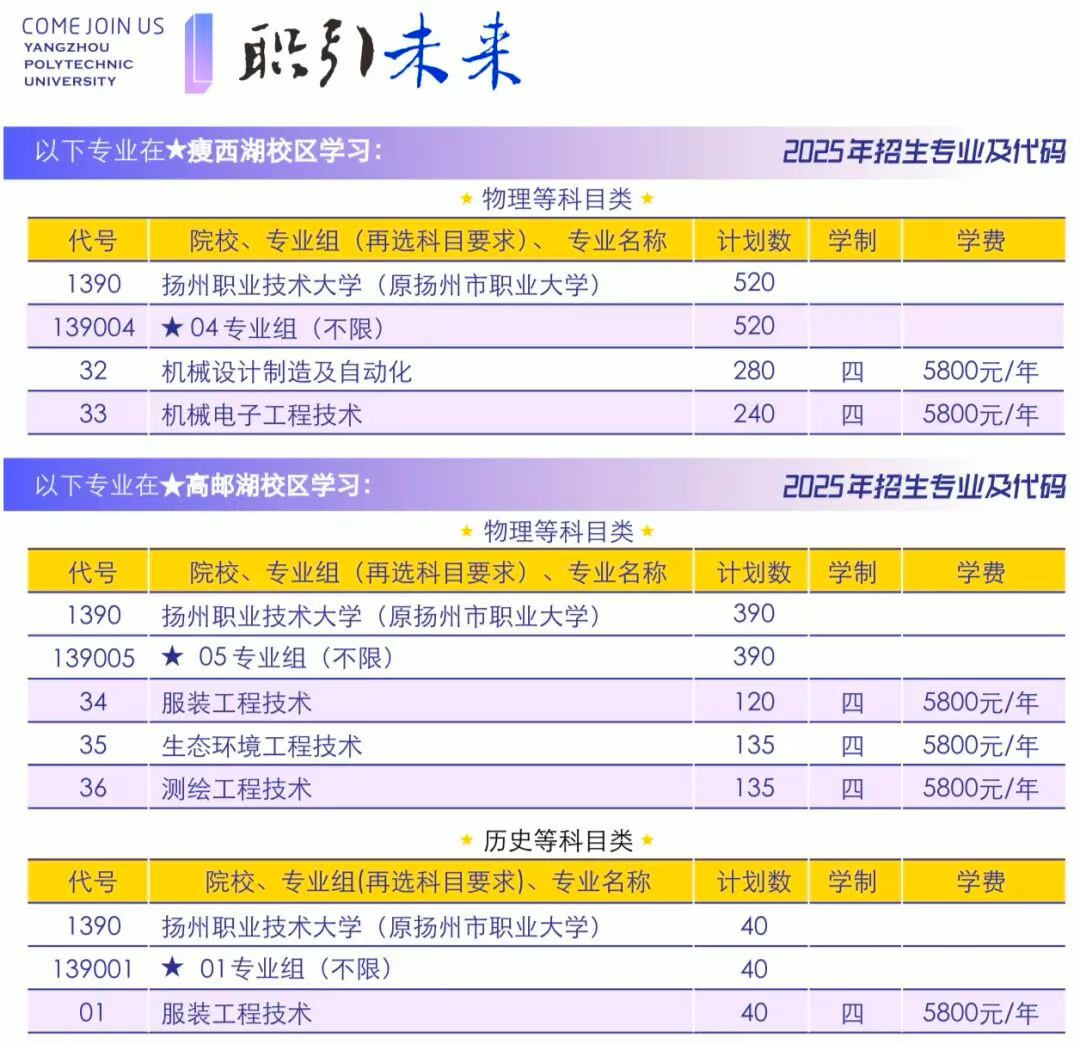 扬州职业技术大学以扬州市职业大学为建校基础设立。参考2025年招生简章,本科专业共计招生950人,招生专业有机械设计制造及自动化、机械电子工程技术、服装工程技术等,2025年本科批在江苏录取分数为历史类最低528分,物理类最低507分。