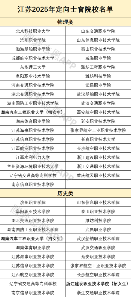最新一年招生计划显示,定向士官在江苏省招生院校中,物理类招生院校35所、历史类招生院校22所,不同院校招生人数、专业、类型等都有差异,为方便2026届考生报考,下面将详细列举这些学校的名单,供查阅: