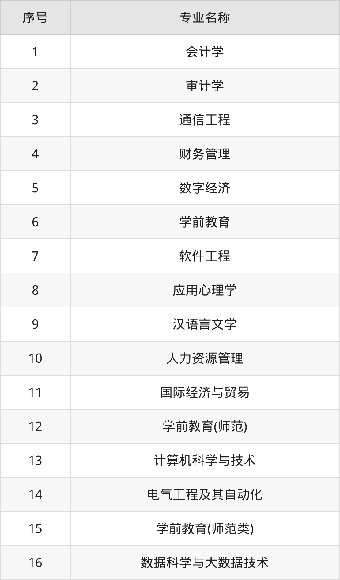 物理类(理科)本科招生专业:会计学、审计学、财务管理、通信工程、软件工程、数字经济、应用心理学、汉语言文学、人力资源管理、国际经济与贸易等。