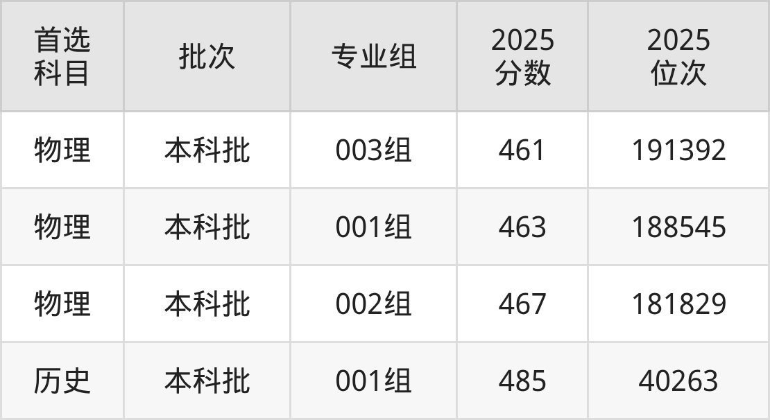 从2025年皖江工学院在安徽省内的录取分数线来看,本科批录取分数线都在460分以上,录取分数线最高的是001组,2025年最低分为485分;录取分数线最低的是003组,2025年最低分为461分。