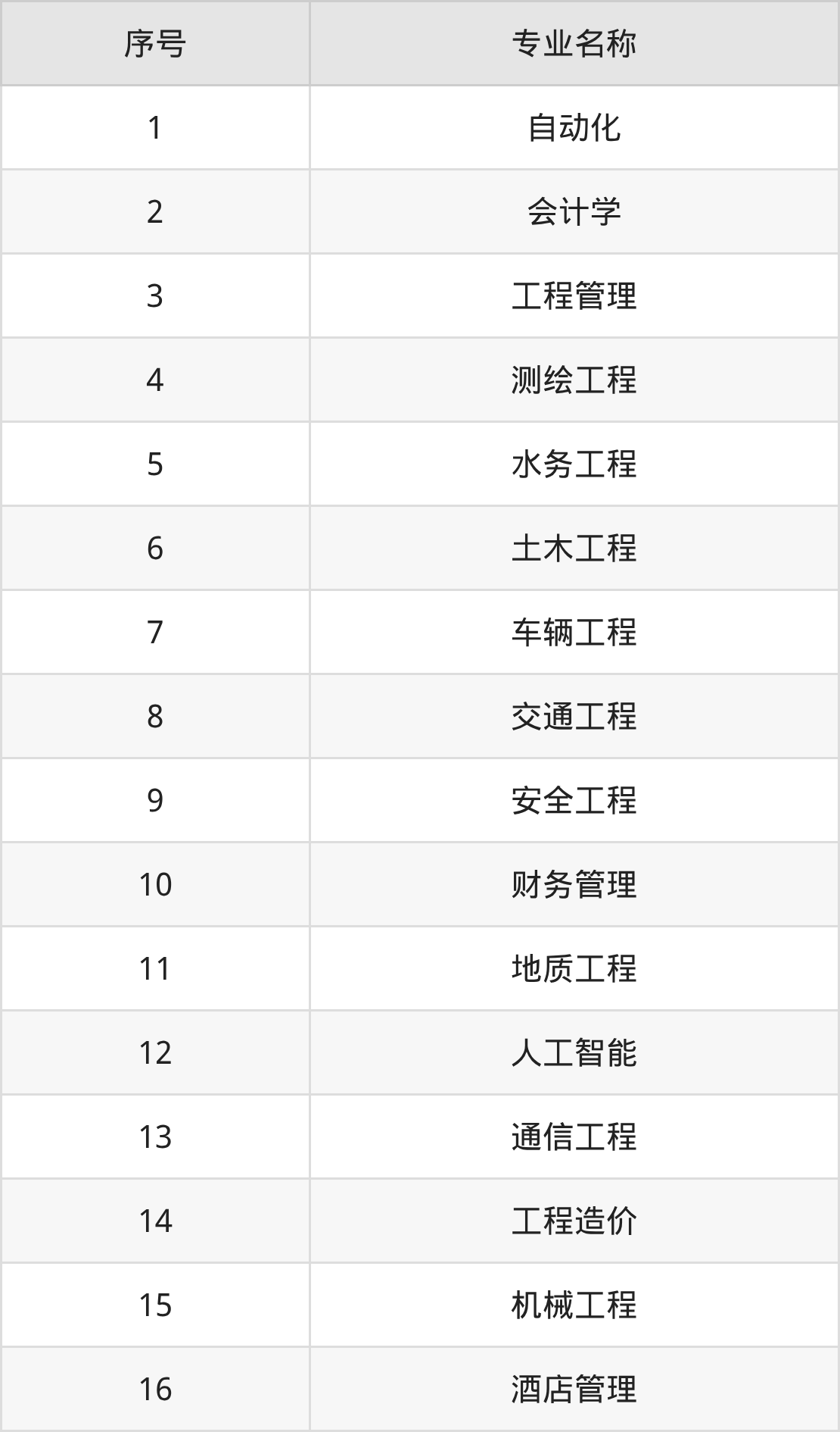 物理类(理科)本科招生专业:自动化、会计学、工程管理、测绘工程、水务工程、土木工程、车辆工程、交通工程、安全工程、财务管理等。