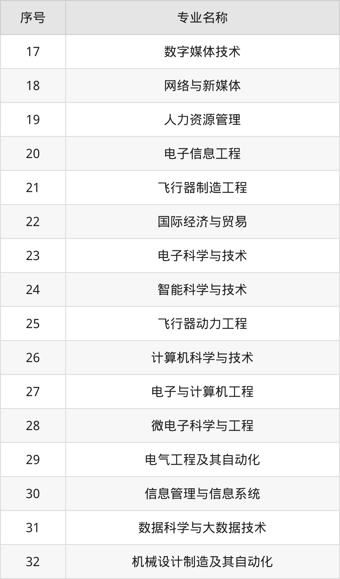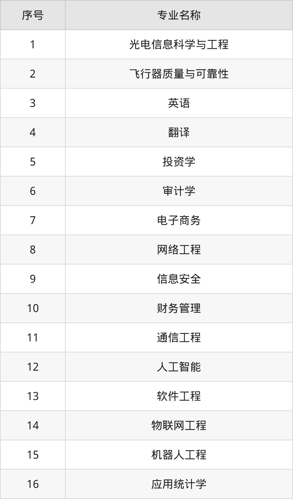 物理类(理科)本科招生专业:光电信息科学与工程、飞行器质量与可靠性、英语、翻译、审计学、投资学、人工智能、电子商务、财务管理、网络工程等。