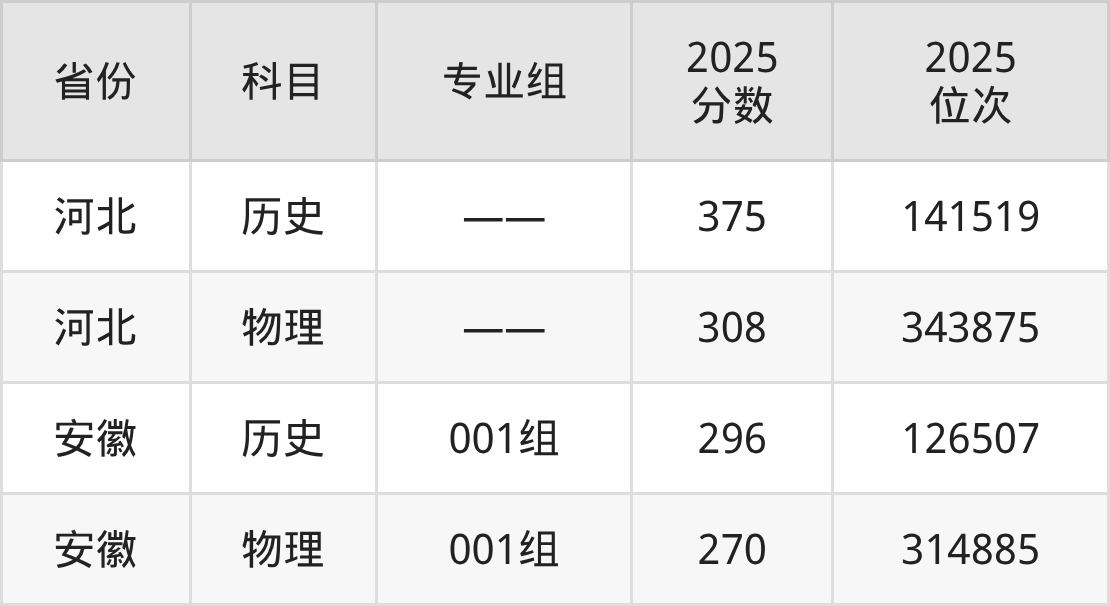 2025年民办合肥经济技术职业学院全国录取分数线270分到375分,录取最高在河北(历史类)、录取最低在安徽(物理类001组)。