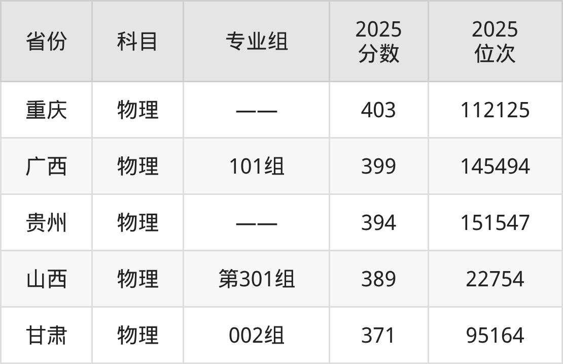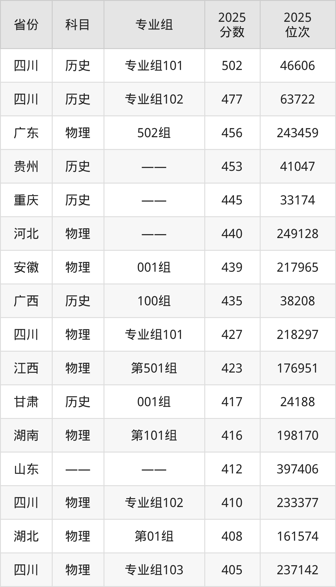 2025年遵义医药高等专科学校全国录取分数线371分到502分,录取最高在四川(历史类专业组101)、录取最低在甘肃(物理类002组)。