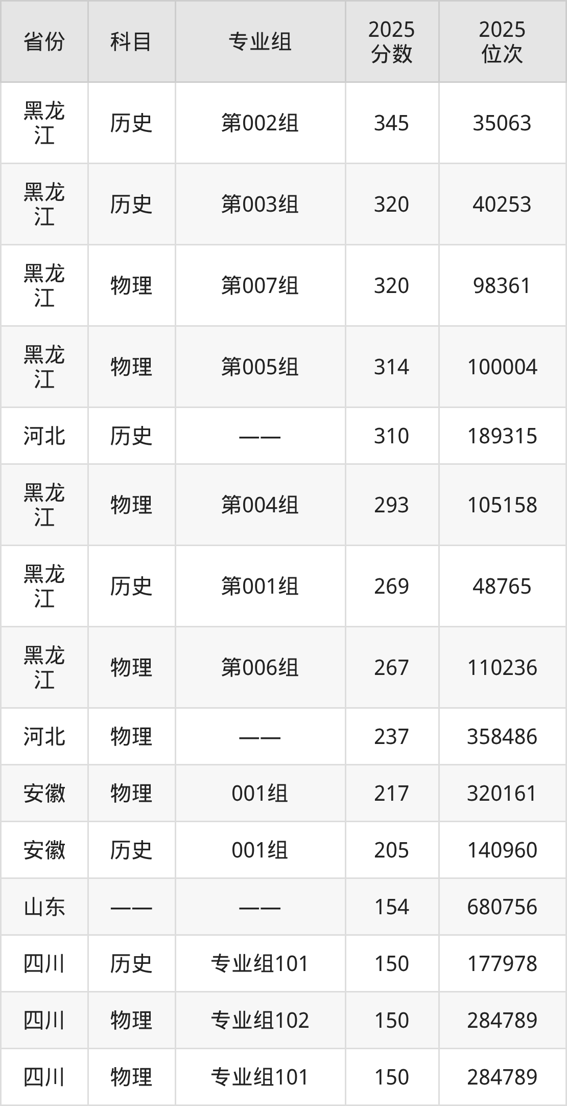2025年烟台城市科技职业学院全国录取分数线150分到345分,录取最高在黑龙江(历史类第002组)、录取最低在四川(物理类专业组101)。