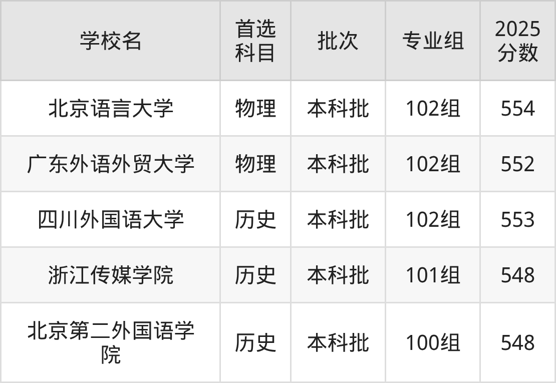 为给各位考生更加详细的参考,下文整理了2025年录取分数线在545分到555分之间的语言类大学名单汇总。
