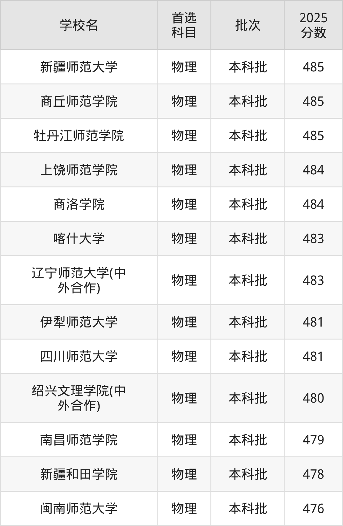 首选物理科目考生能上的有13所,全部在本科批次录取。具体有:新疆师范大学(485分)、商丘师范学院(485分)、牡丹江师范学院(485分)、上饶师范学院(484分)等。