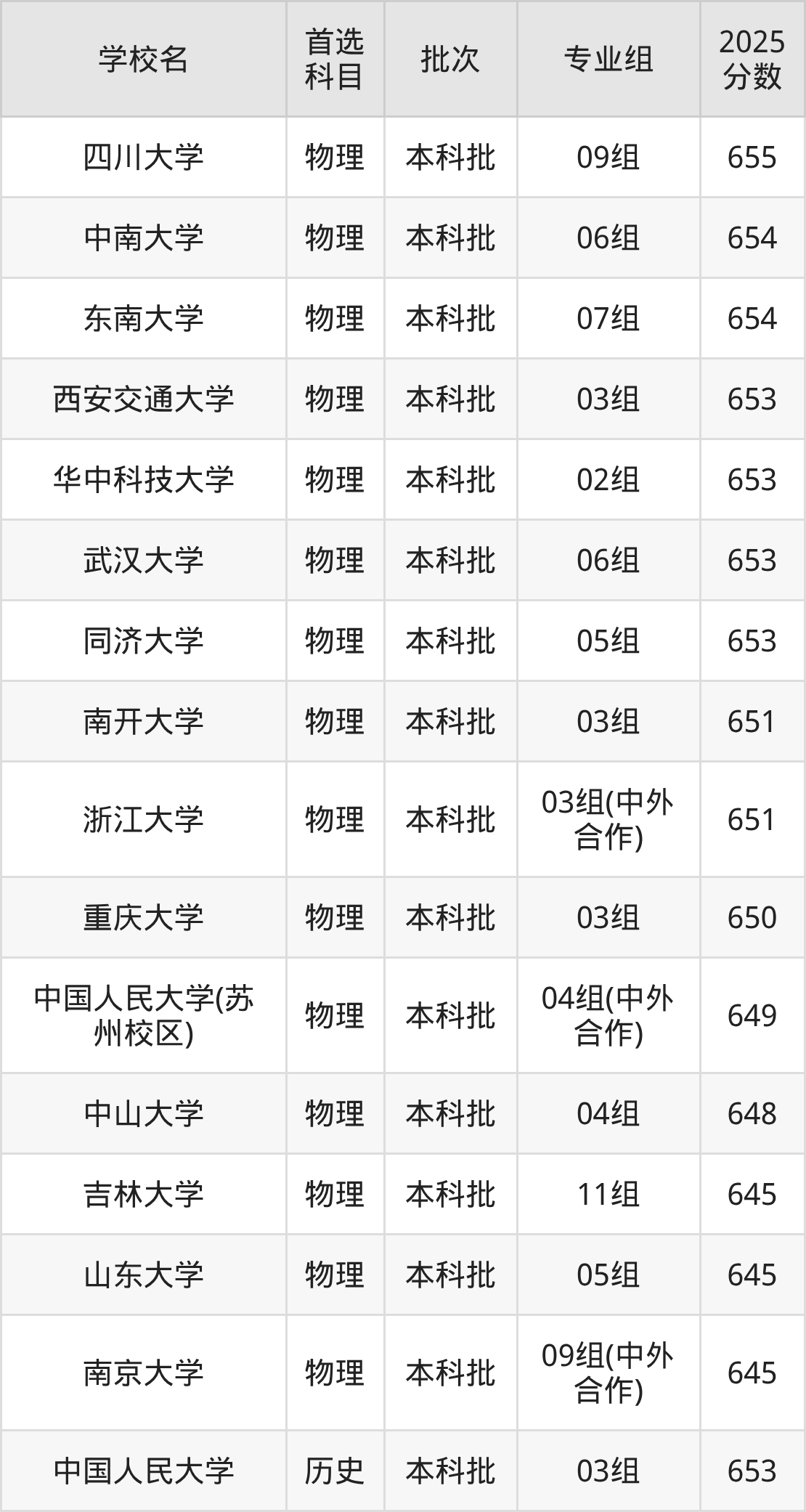 首选物理科目考生能上的有15所,全部在本科批次录取。具体有:四川大学09组(655分)、中南大学06组(654分)、东南大学07组(654分)、西安交通大学03组(653分)等;