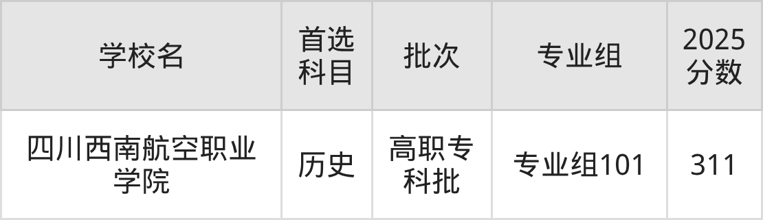 1、四川西南航空职业学院(2025年历史类专业组101311分)