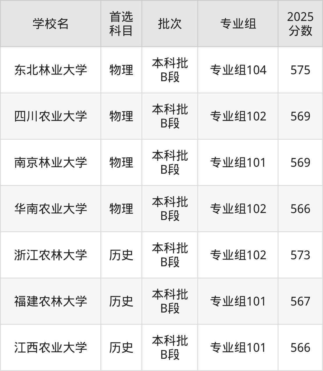 首选物理科目考生能上的有4所,全部在本科批次录取。具体有:东北林业大学专业组104(575分)、四川农业大学专业组102(569分)、南京林业大学专业组101(569分)、华南农业大学专业组102(566分)等;