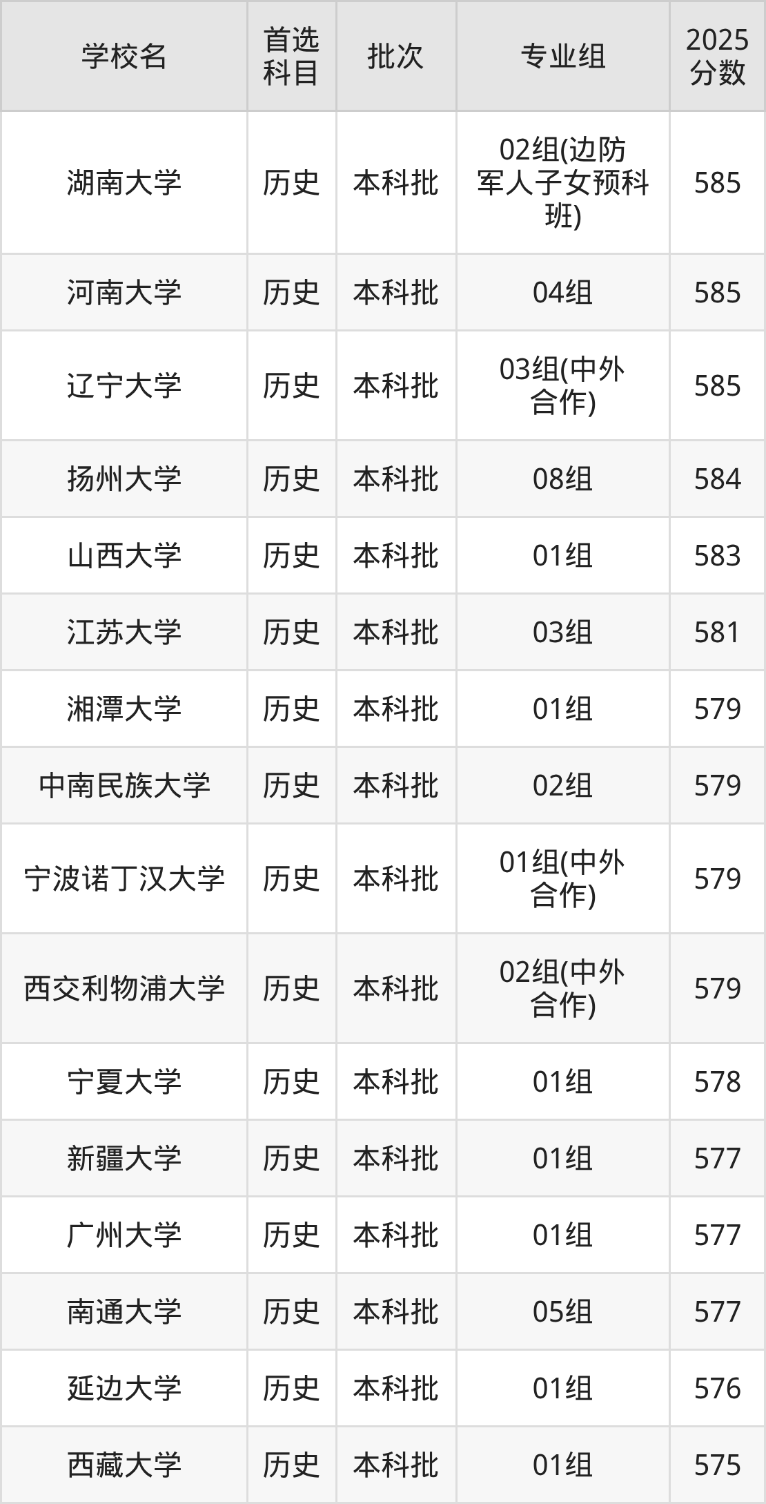 首选历史科目考生能上的有16所,全部在本科批次录取。具体有:湖南大学02组(边防军人子女预科班)(585分)、河南大学04组(585分)、辽宁大学03组(中外合作)(585分)、扬州大学08组(584分)等;