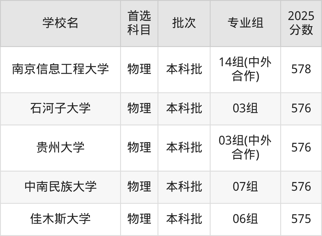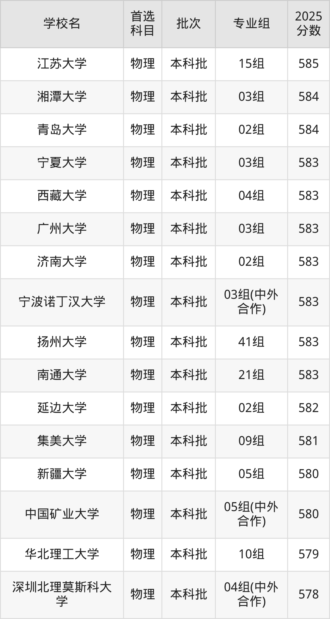 首选物理科目考生能上的有21所,全部在本科批次录取。具体有:江苏大学15组(585分)、湘潭大学03组(584分)、青岛大学02组(584分)、宁夏大学03组(583分)等。