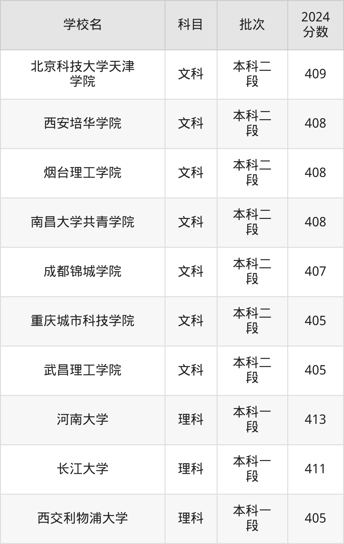 文科科目考生能上的有23所,全部在本科批次录取。具体有:山西传媒学院(415分)、北京中医药大学东方学院(414分)、兰州城市学院(414分)、昆明学院(414分)等;