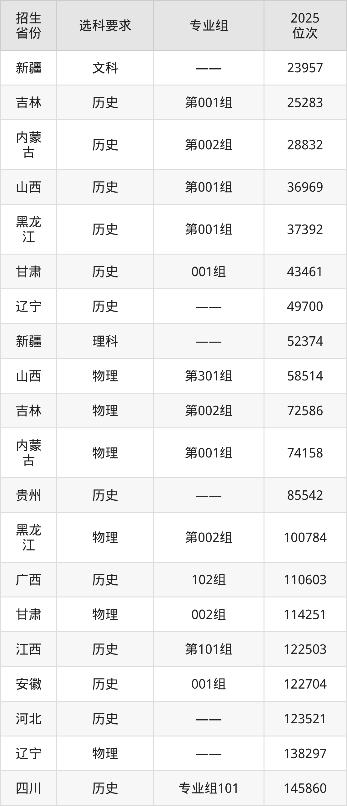 辽宁地质工程职业学院2025年在全国各省的位次差异较大,最高位次是23957位(新疆文科)、最低位次是373271位(广东物理类)。各省具体位次请看下图: