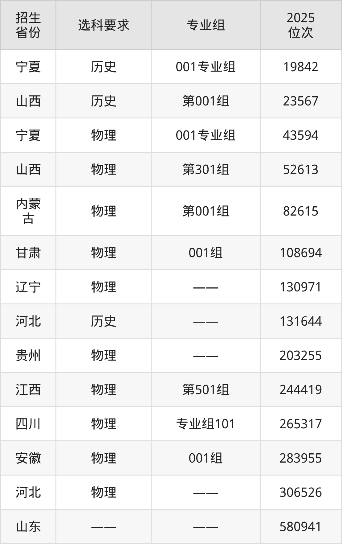 烟台工程职业技术学院2025年在全国各省的位次差异较大,最高位次是19842位(宁夏历史类)、最低位次是580941位(山东)。各省具体位次请看下图: