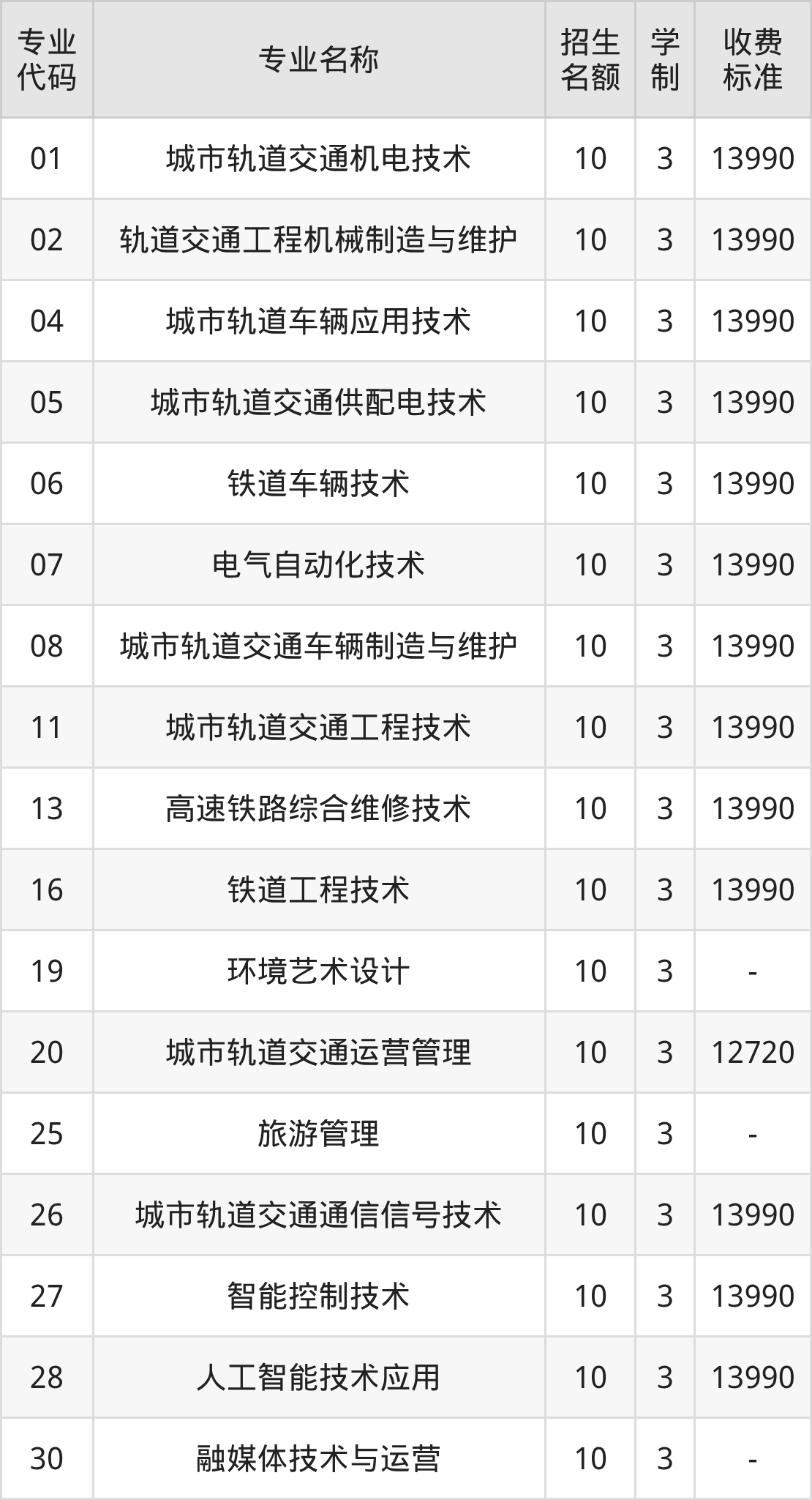 德阳城市轨道交通职业学院城市轨道交通机电技术专业在专科批历史类招10人,学制3年,专业招生代码是01,学费是13990元一年。德阳城市轨道交通职业学院轨道交通工程机械制造与维护专业在专科批历史类招10人,学制3年,专业招生代码是02,学费是13990元一年。