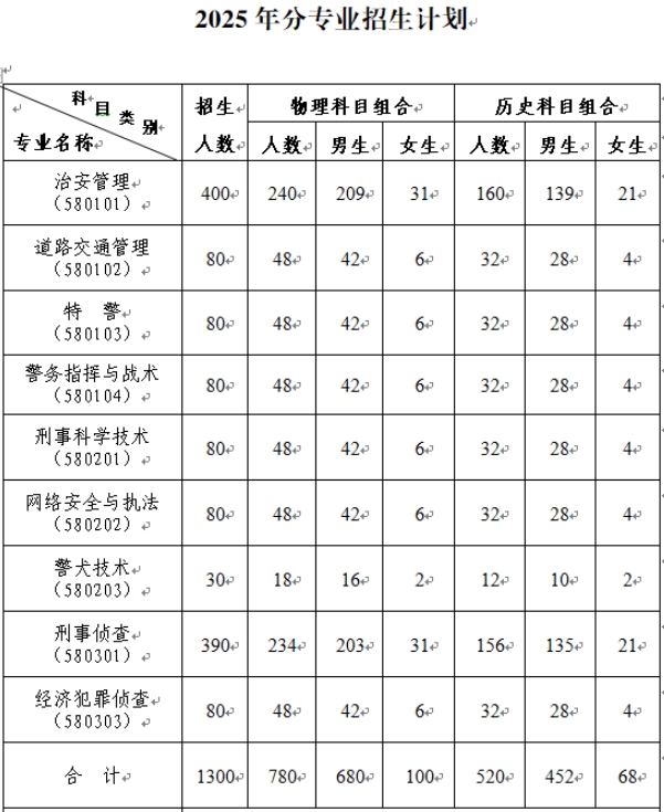 河北公安警察职业学院招生计划共计1300人,均为公安专业,各专业招生计划如下: