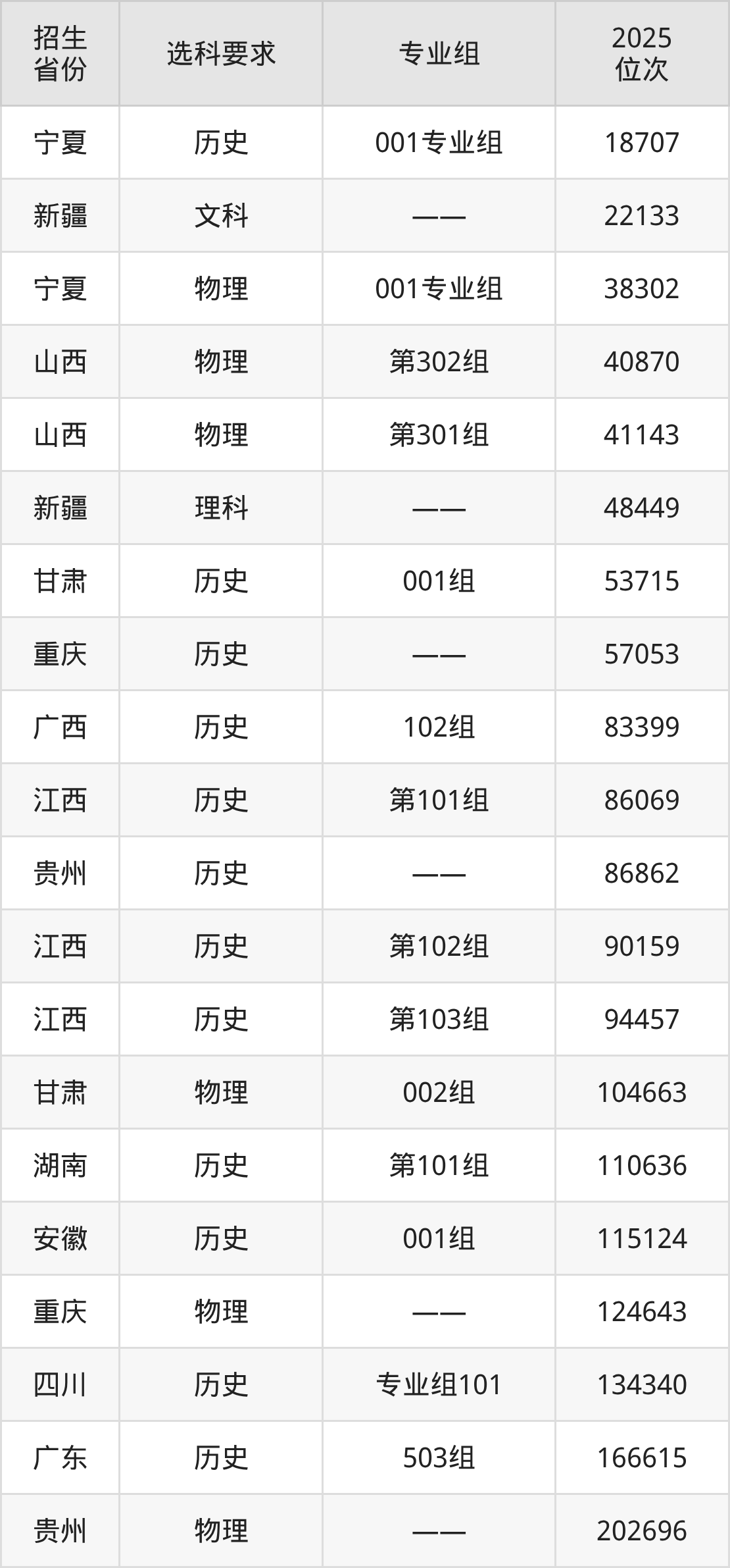 湖南九嶷职业技术学院2025年在全国各省的位次差异较大,最高位次是18707位(宁夏历史类)、最低位次是364860位(广东物理类)。各省具体位次请看下图: