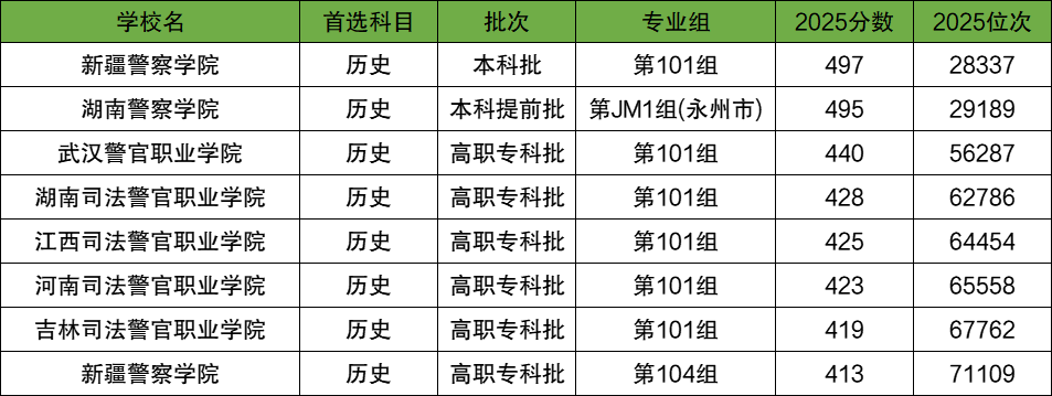 湖南历史类400到500分的警校名单: