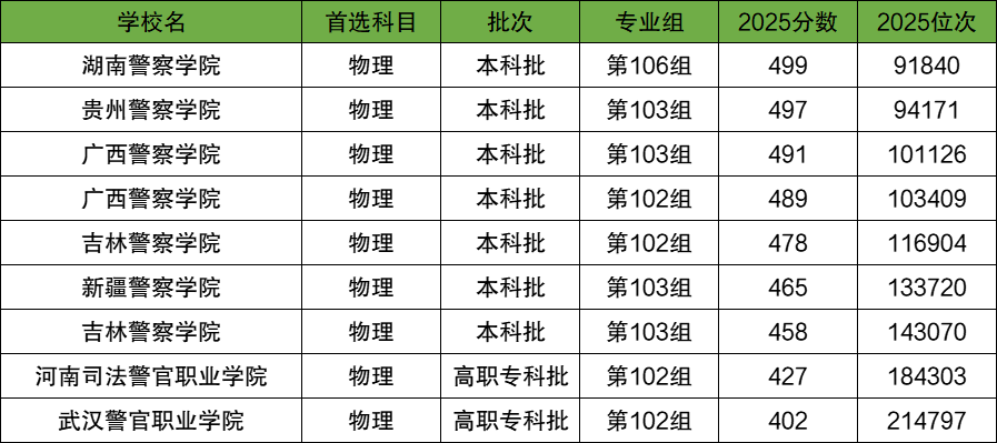 湖南物理类400到500分的警校名单:
