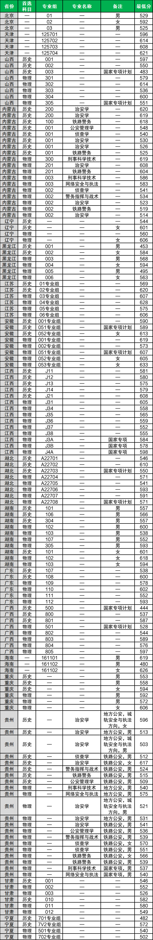 专业选科备注:3+3省份要求公安学类专业必选政治,公安技术类专业必选物理+化学。3+1+2省份的招生计划分为A、B、C类,其中A类计划专业必选“历史+政治”,B类计划专业必选“物理+政治”,C类计划专业必选“物理+化学”。