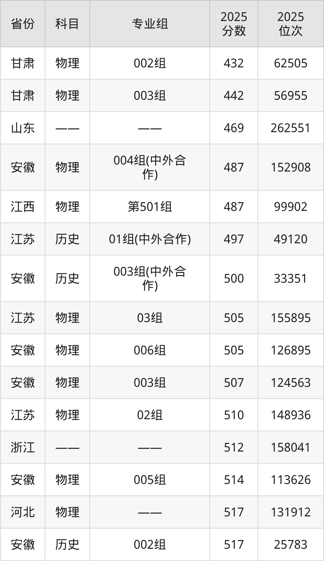 物理类:2025年巢湖学院录取最低分是432分(甘肃),对应的位次排名是62505名。