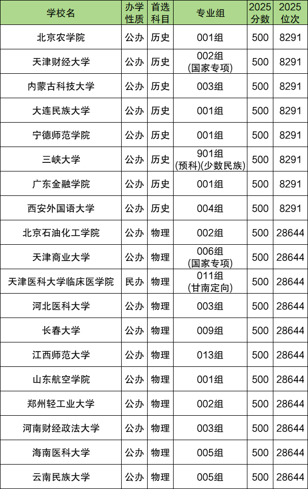 甘肃高考500分物理类位次是28644名,2025年该分数位次对应能上的学校有河北医科大学003组、山东航空学院001组、海南医科大学005组等;历史类500分位次是8291名,2025年该分数位次对应的大学有大连民族大学001组、西安外国语大学004组、宁德师范学院001组等,具体名单如下表所示: