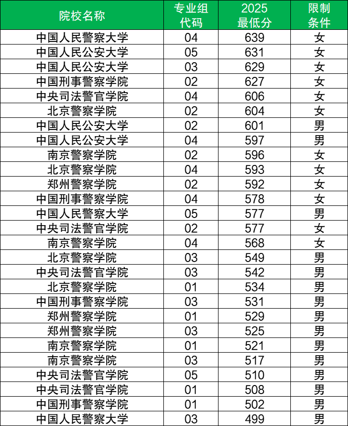 从性别角度来看,警校女生最低需568分(南京警察学院,专业组代码04),比男生最低分(499分)高出69分。