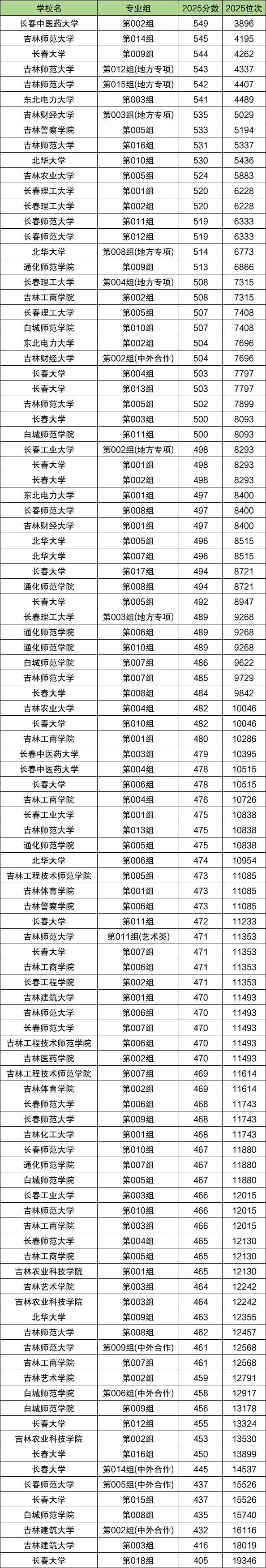 2025年吉林历史组公办二本大学录取分数线位于405分到549分之间,对应位次排名从19346位到3896位。