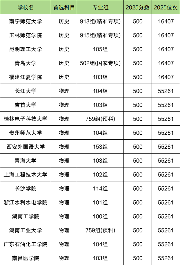广西高考500分物理类位次是55261名,对应能上的学校有贵州师范大学106组、上海工程技术大学102组、浙江水利水电学院101组等;历史类500分位次是16407名,对应的大学有玉林师范学院915组、昆明理工大学1056组、福建江夏学院103组等,具体名单如下表所示: