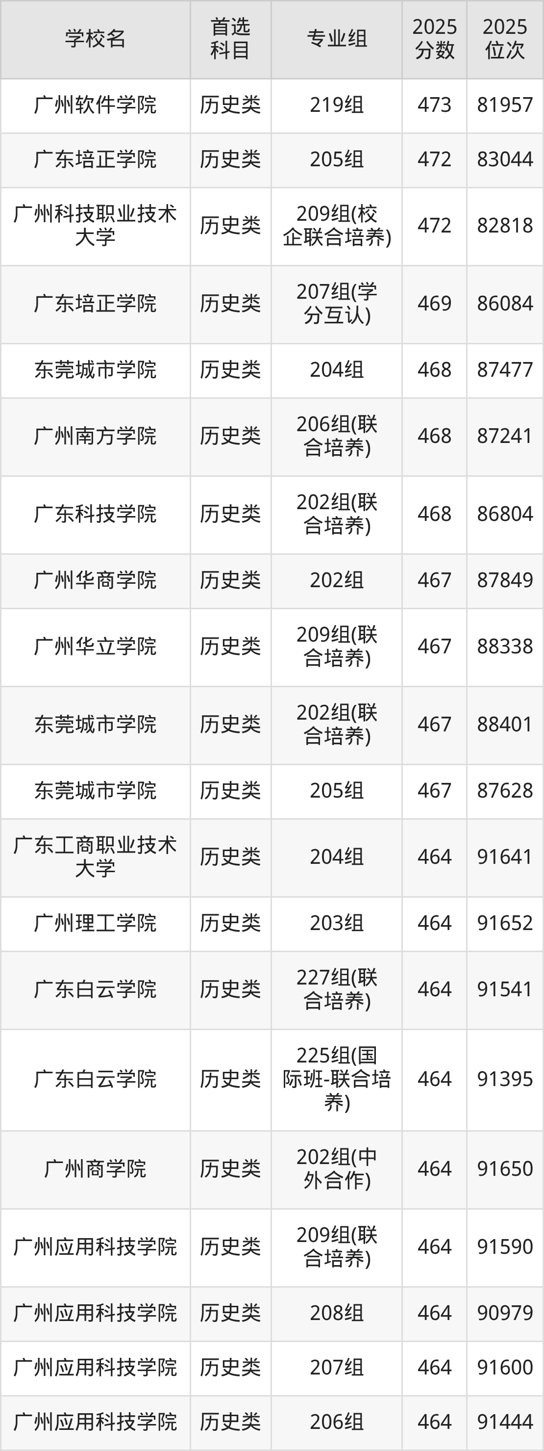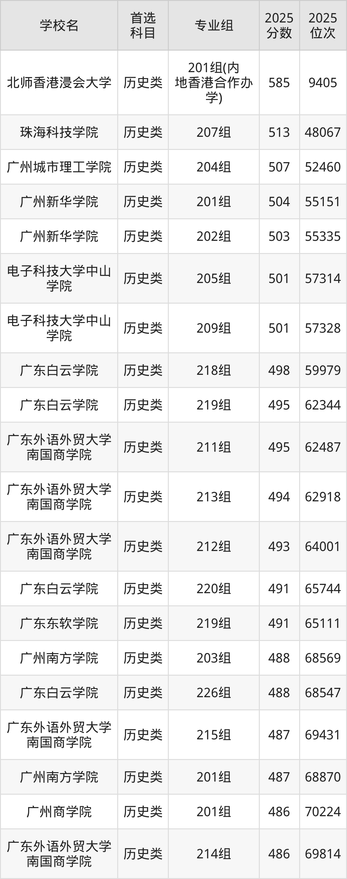 2025年一共有24所民办本科在广东历史类招生,包含了88个专业组,录取分数线从464分到585分不等,对应最低位次从91641名到9405名。下面分别展示广东省分数线最高、最低的五个院校专业组。