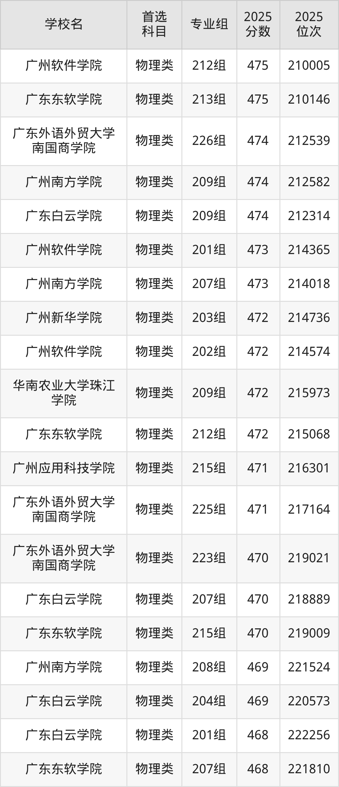 2025年一共有25所民办本科在广东物理类招生,包含了176个专业组,录取分数线从436分到589分不等,对应最低位次从276431名到35286名。下面分别展示广东省分数线最高、最低的五个院校专业组。