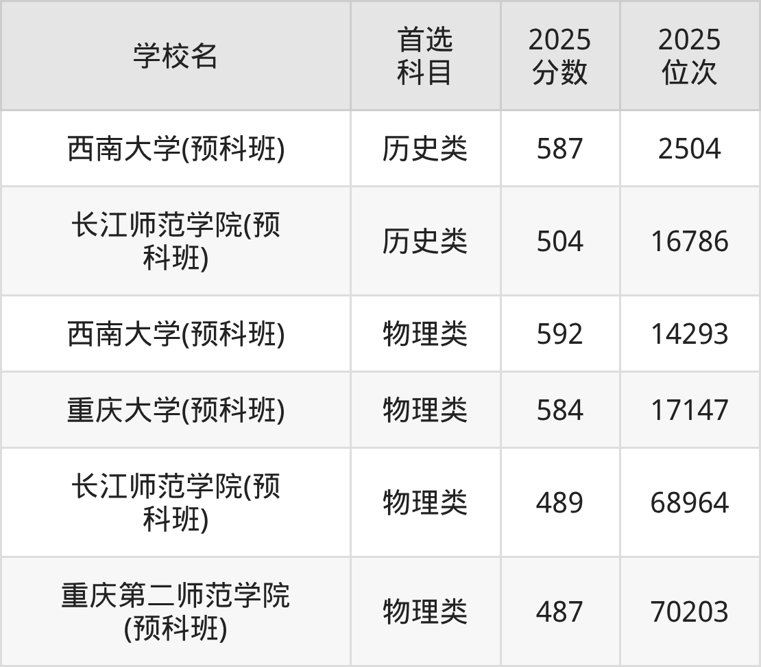 2025年一共有4所少数民族预科班在重庆物理类招生,录取分数线从487分到592分不等,对应最低位次从70203名到14293名。