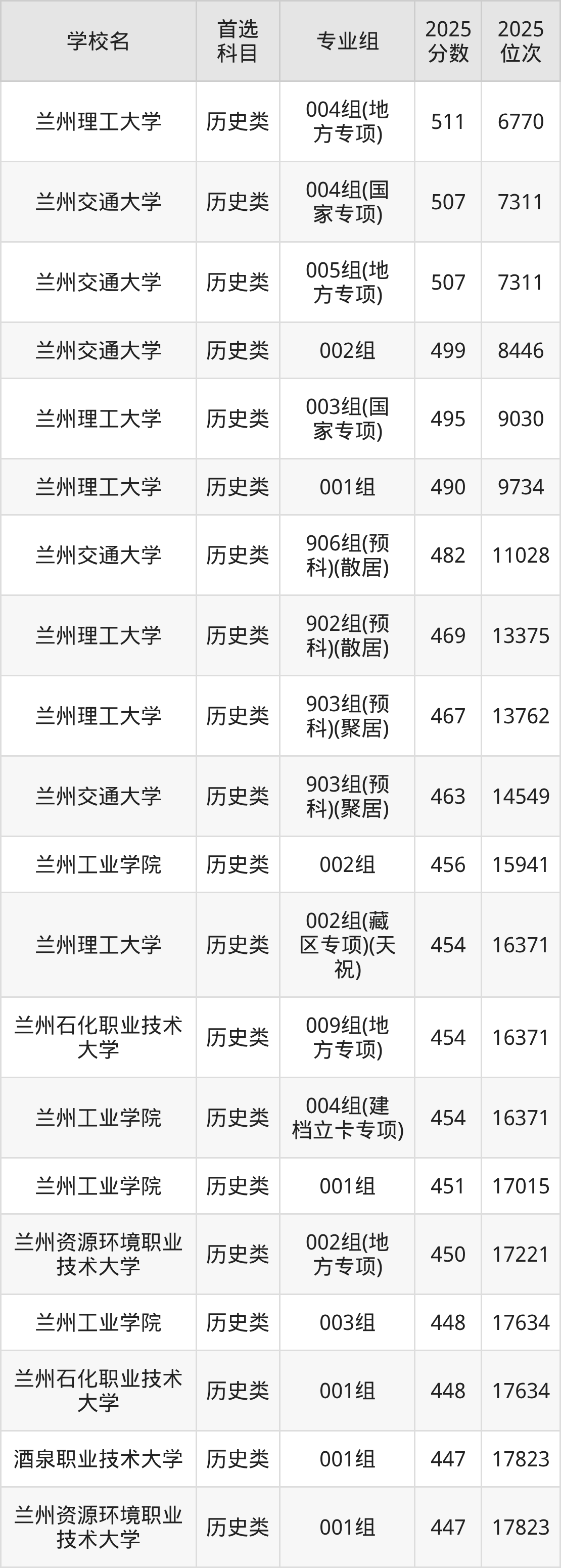 (1)兰州理工大学004专业组(地方专项计划):511分、6770名;