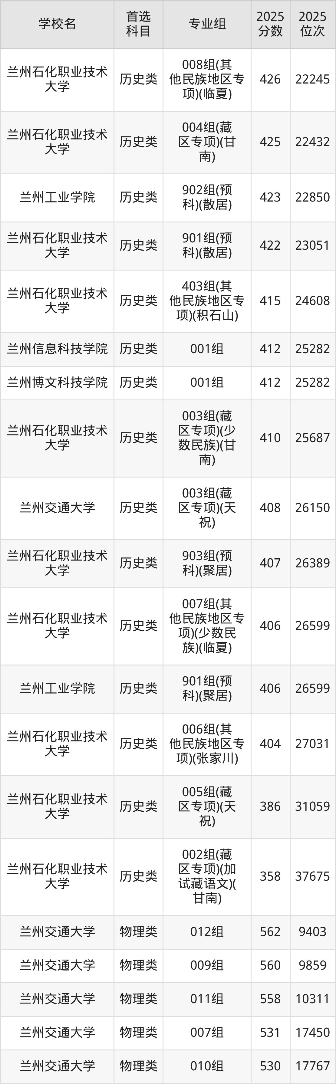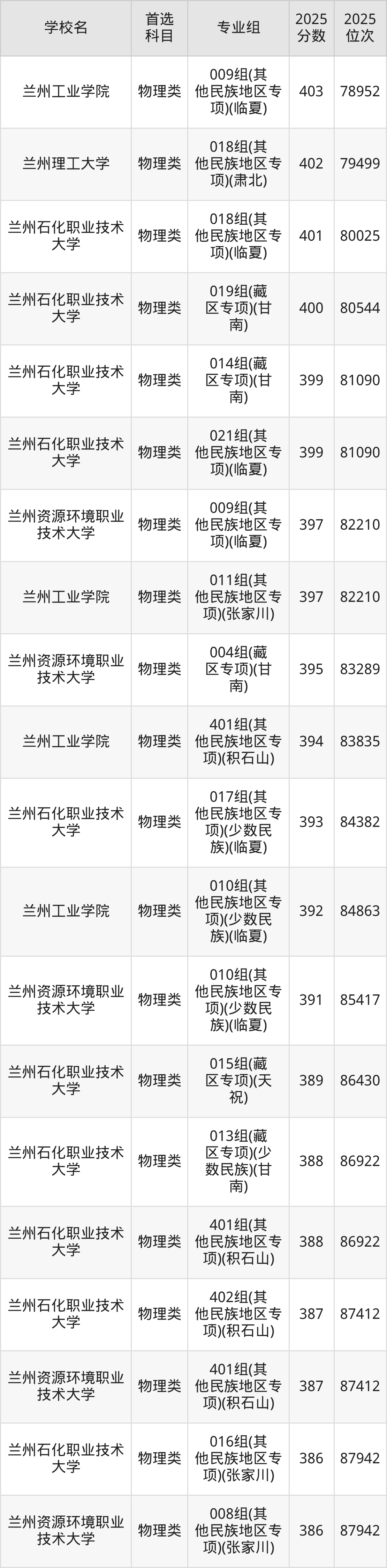 (3)兰州石化职业技术大学006专业组(其他民族地区专项)(张家川):404分、27031名;